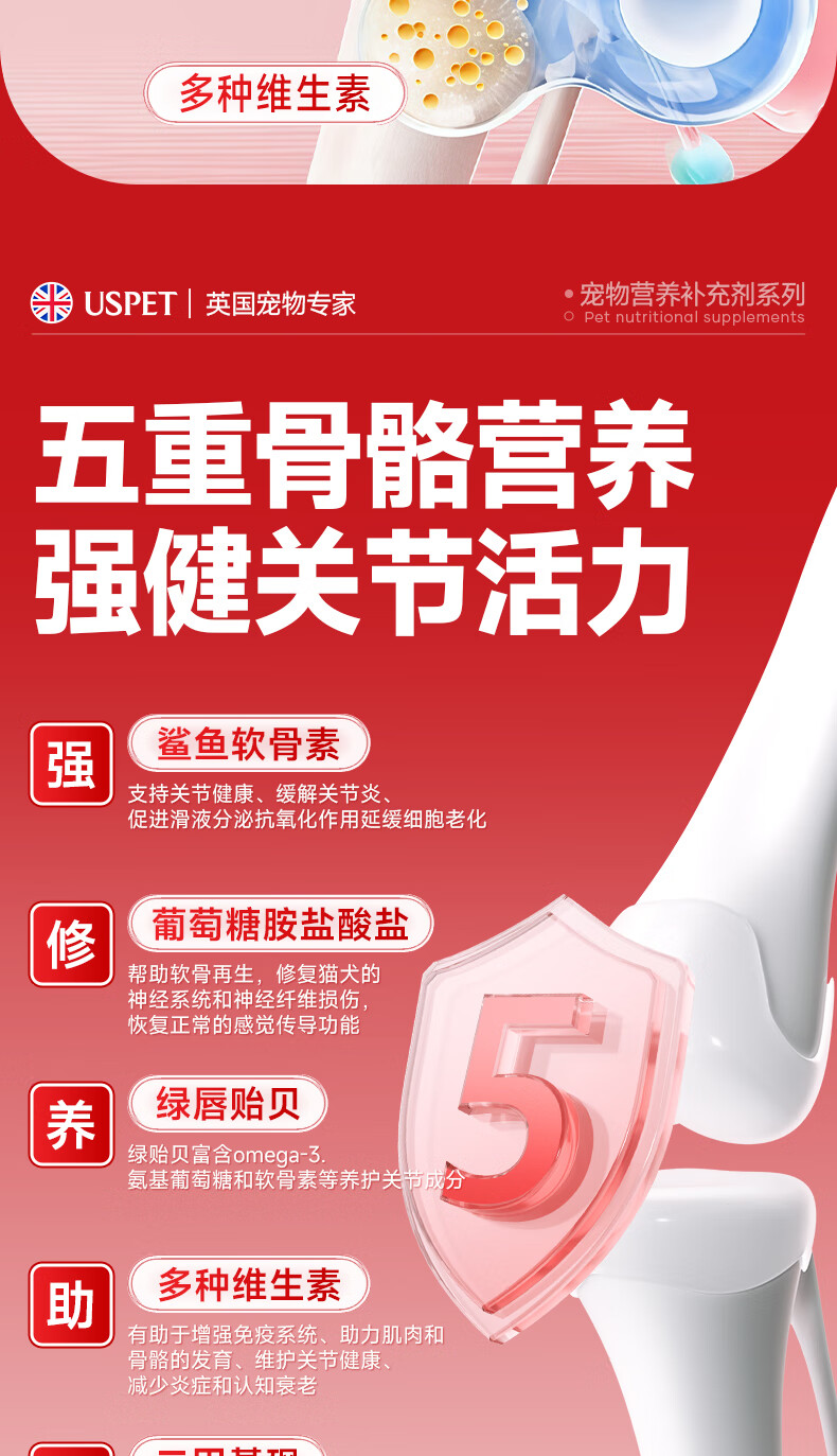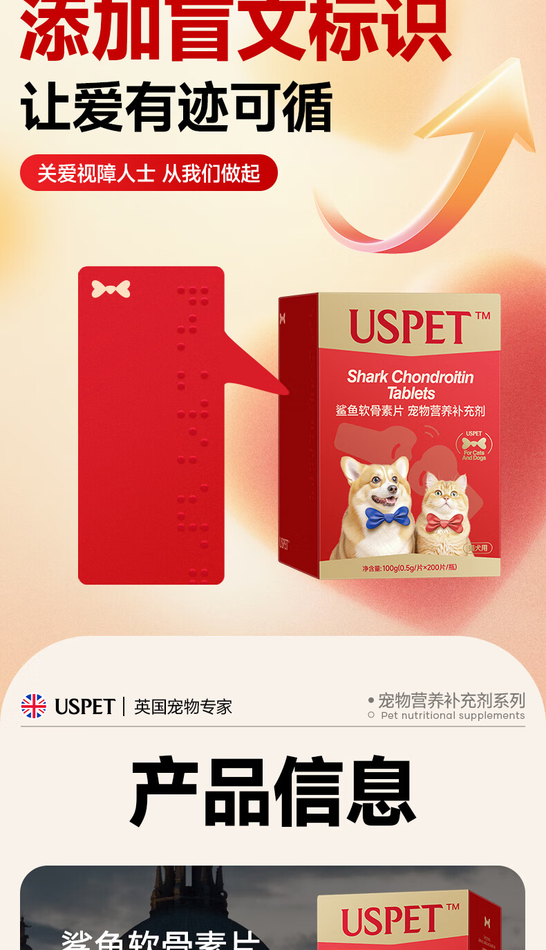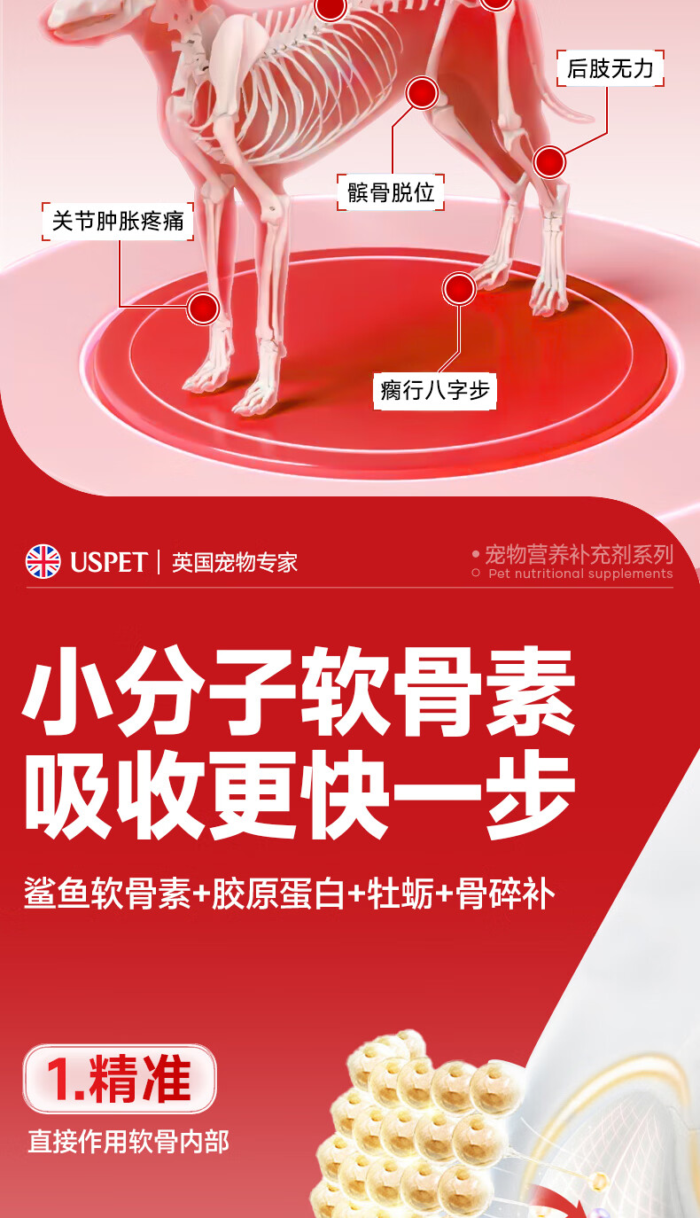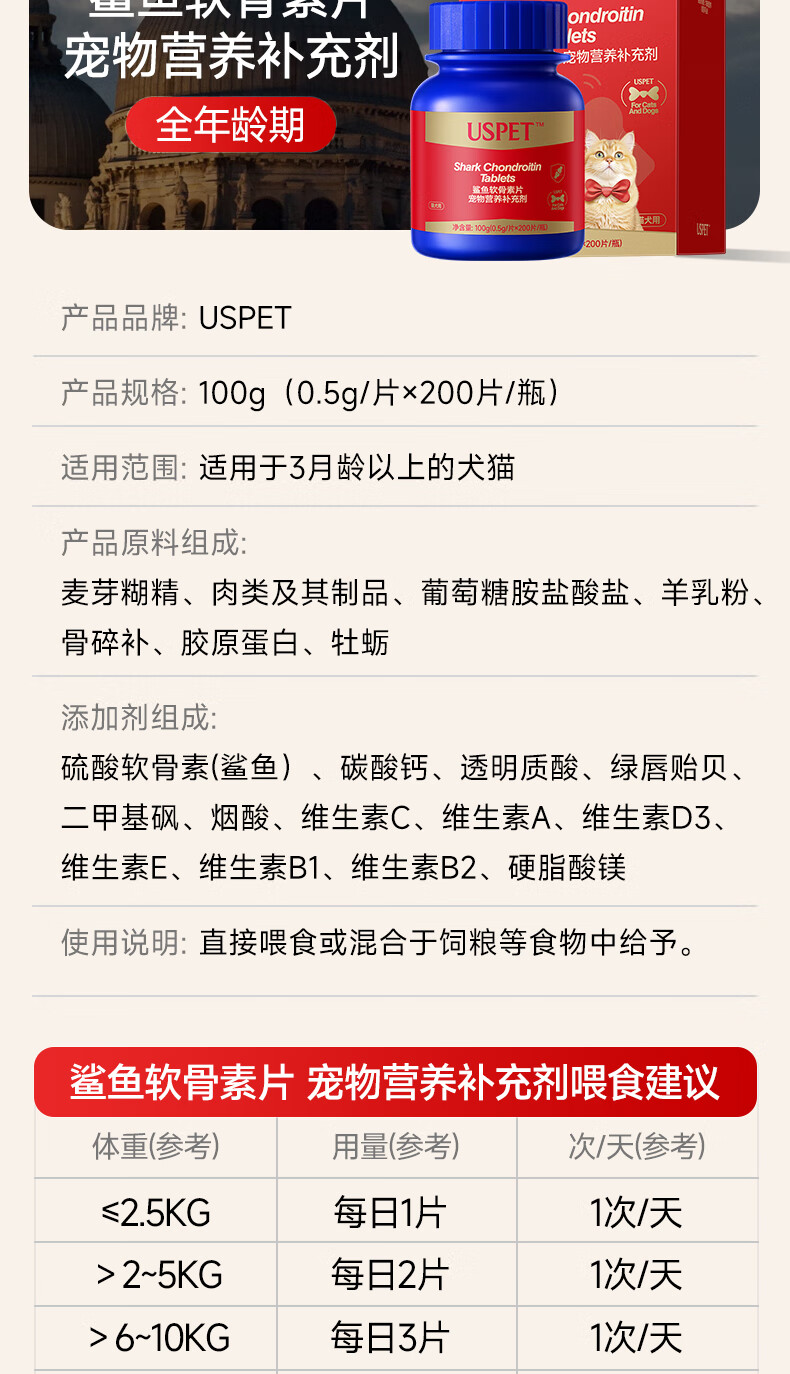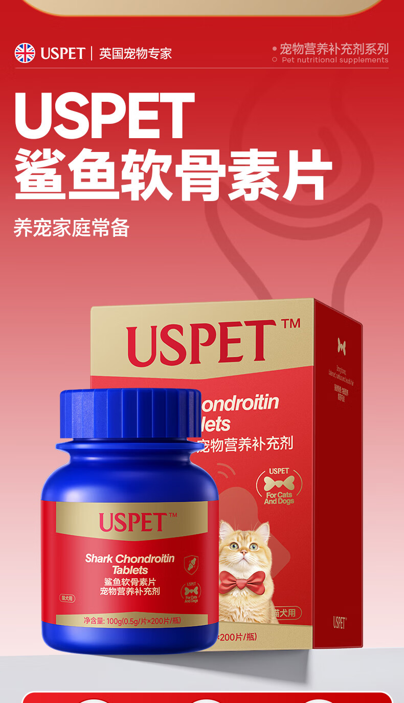 USPET英国鲨鱼软骨素狗狗猫咪钙片宠物骨骼关节修复补钙健骨0.5g*200片