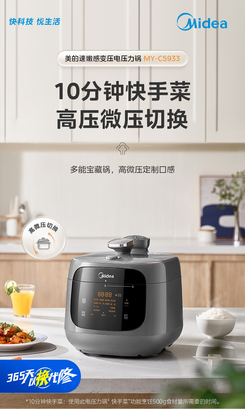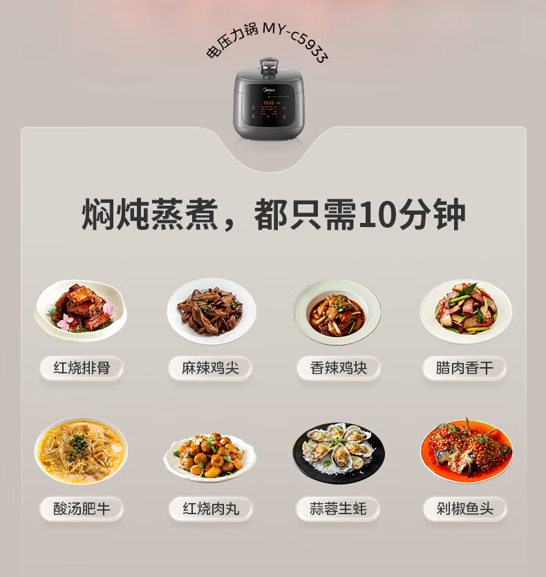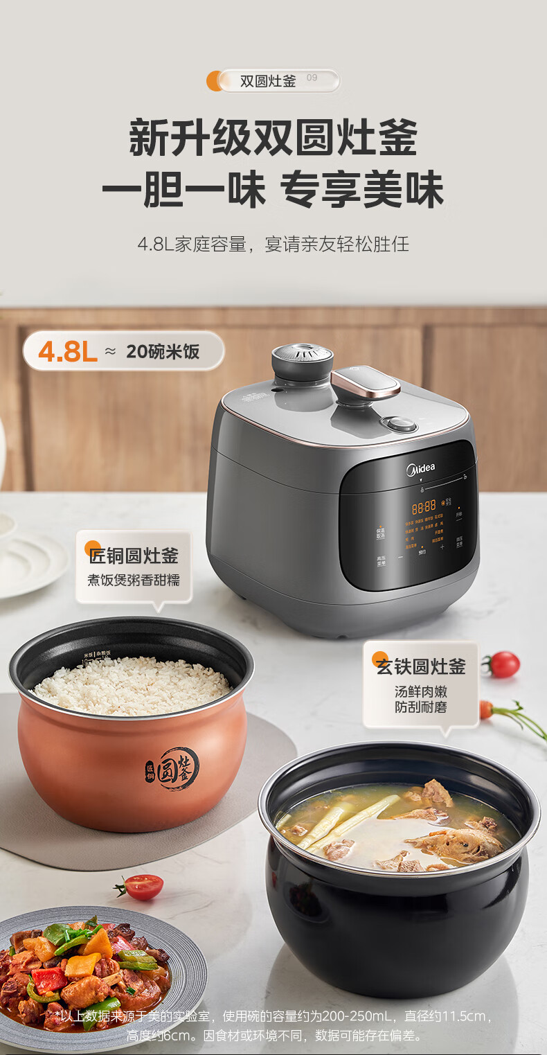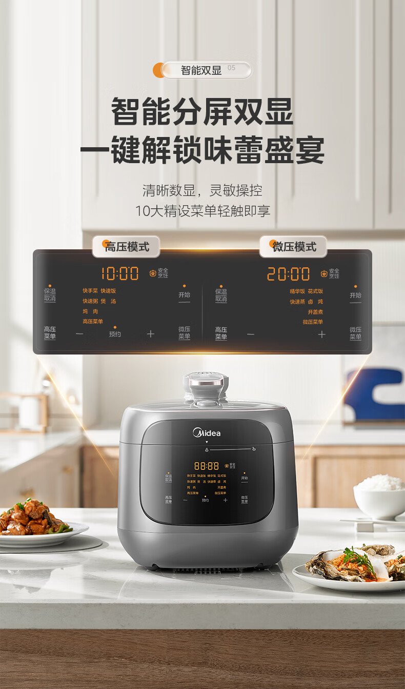 美的(Midea)双胆圆釜电压力锅十分钟快手菜 高低压70KPA 猛火全自动智能预约高压电饭煲5L MY-C5933 【球釜双胆】高微压切换 5L