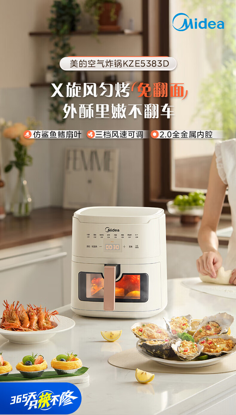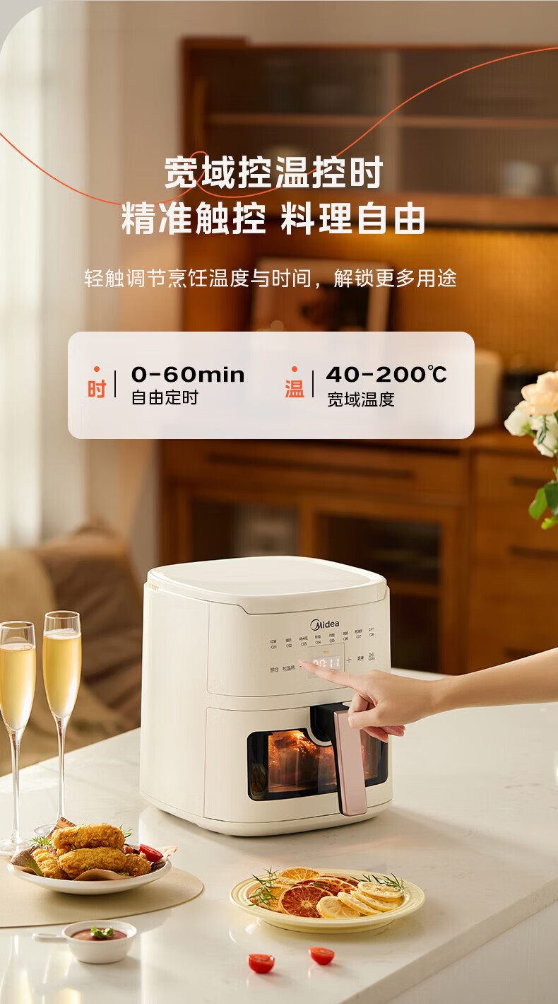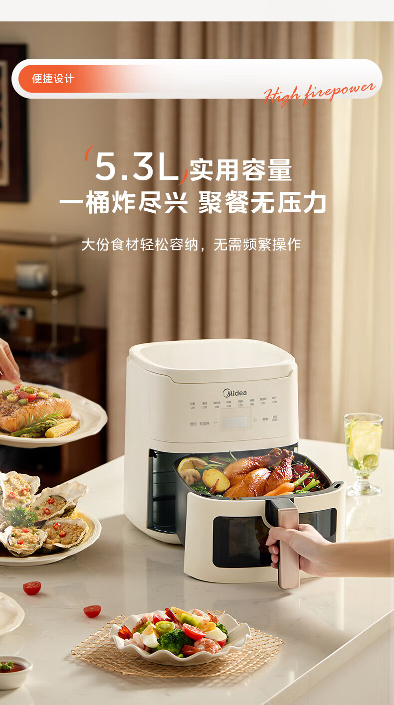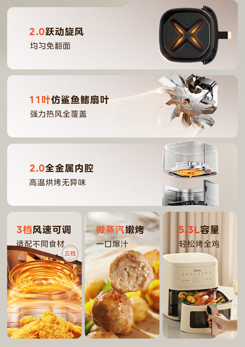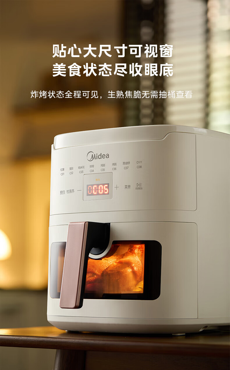 美的(Midea)空气炸锅家用可视不用翻面大容量精准控温定时免翻面无油烟电炸锅低脂煎炸锅炸鸡薯机条空气烤箱 【微蒸汽嫩烤 免翻面】风速可调 5.3L