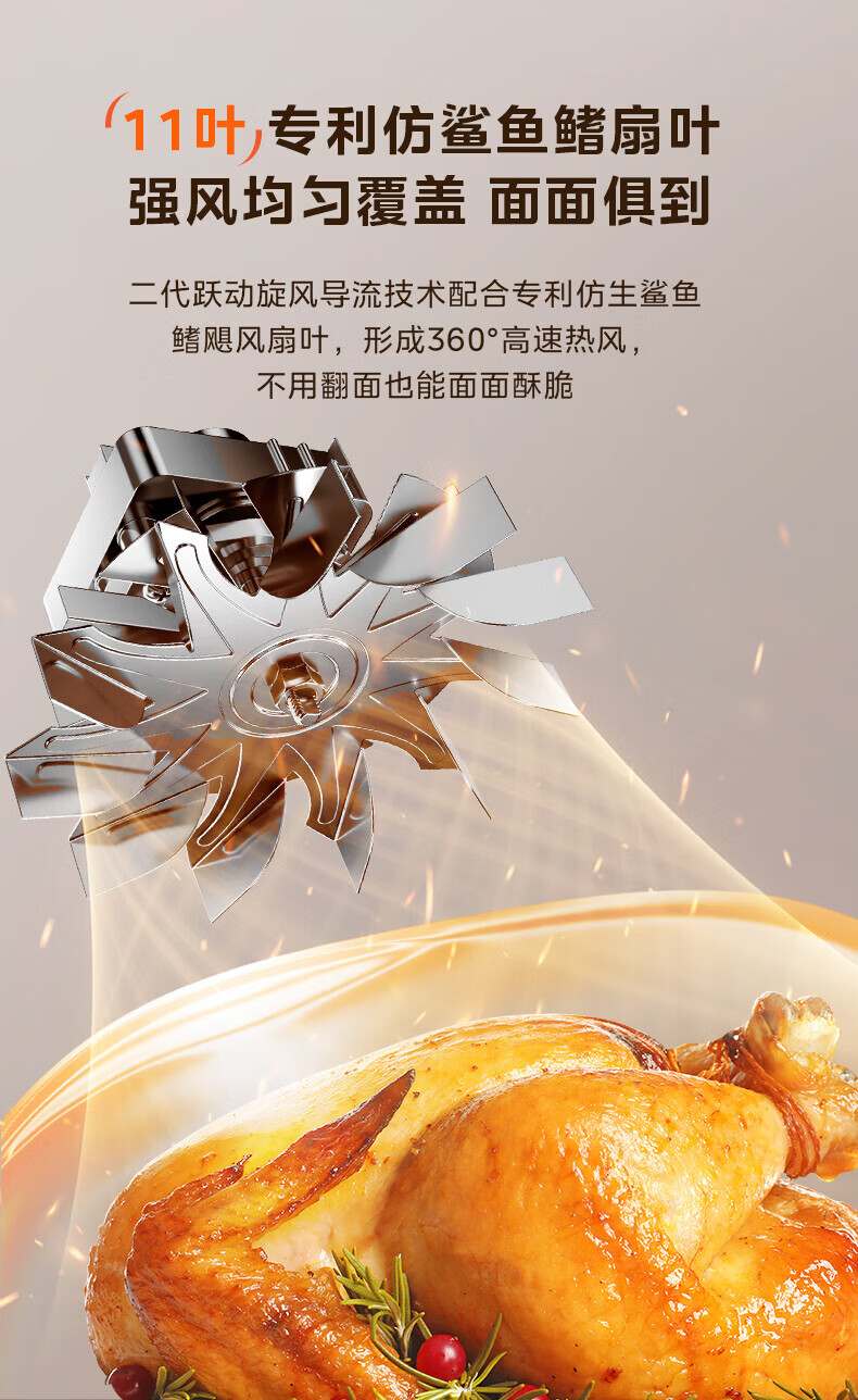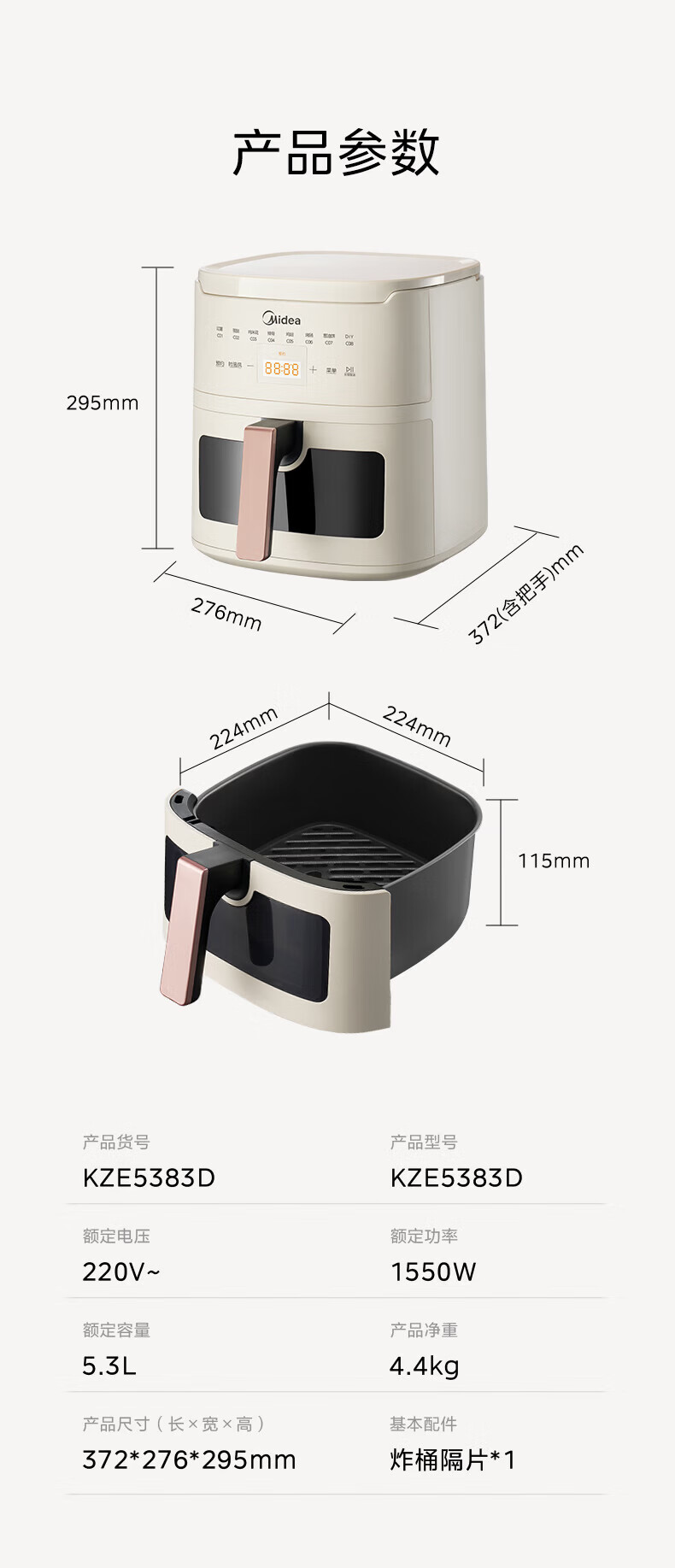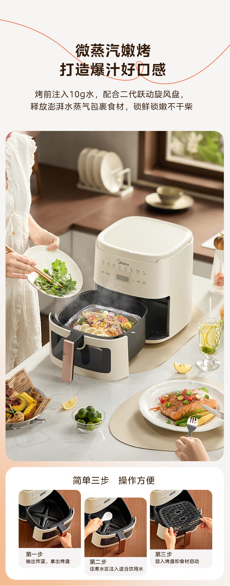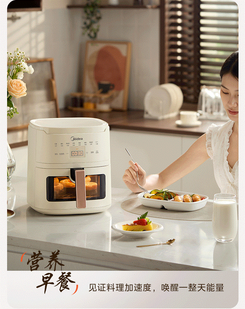 美的(Midea)空气炸锅家用可视不用翻面大容量精准控温定时免翻面无油烟电炸锅低脂煎炸锅炸鸡薯机条空气烤箱 【微蒸汽嫩烤 免翻面】风速可调 5.3L