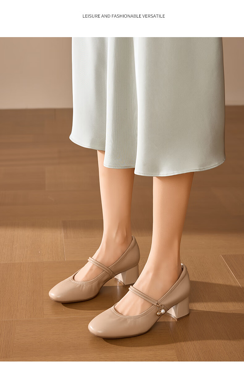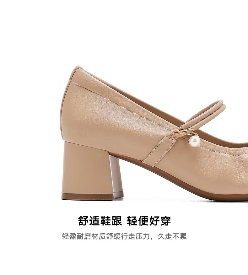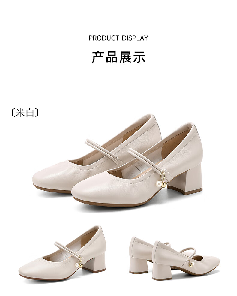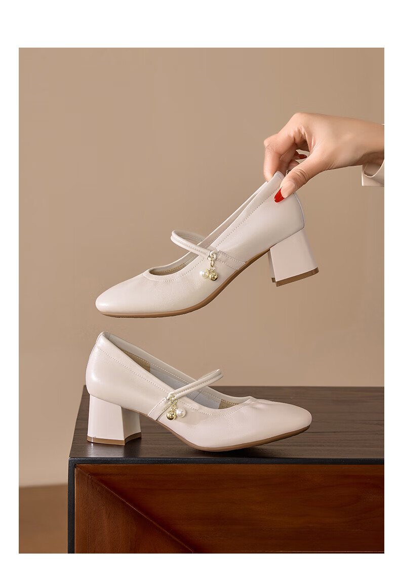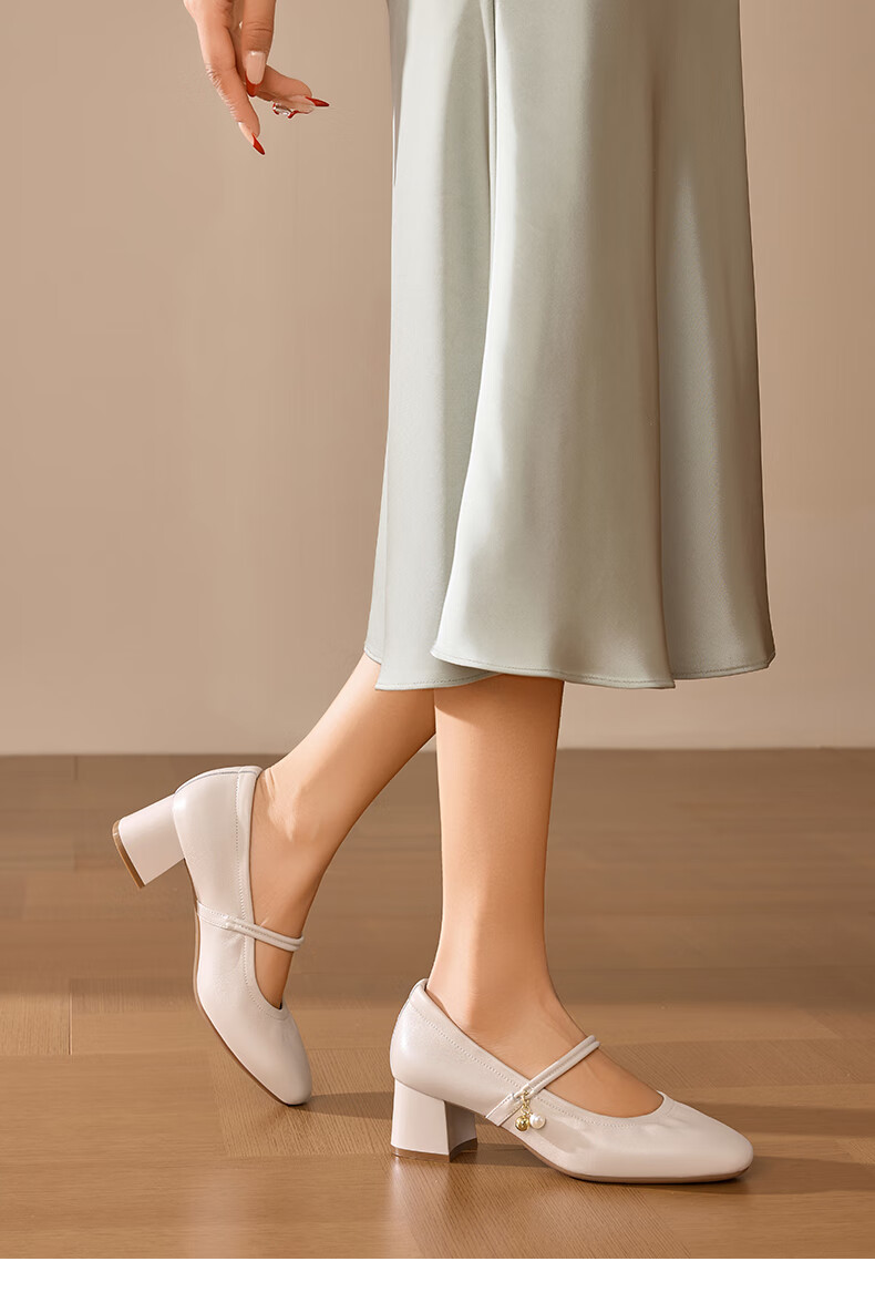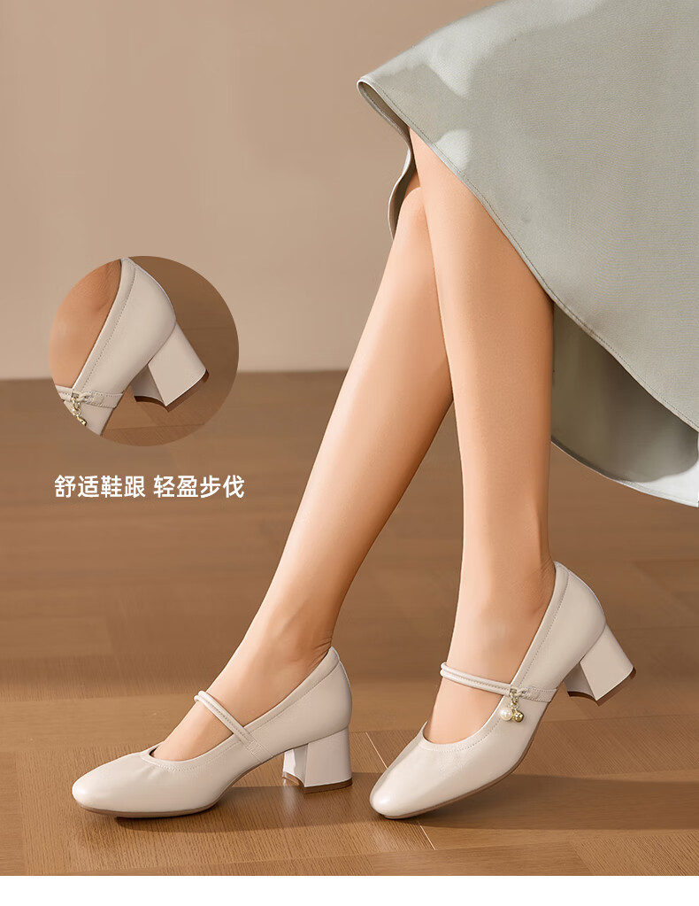 星期六羊皮高跟鞋女2025夏季新款法式复古单鞋粗跟不累脚玛丽珍鞋 米白 35