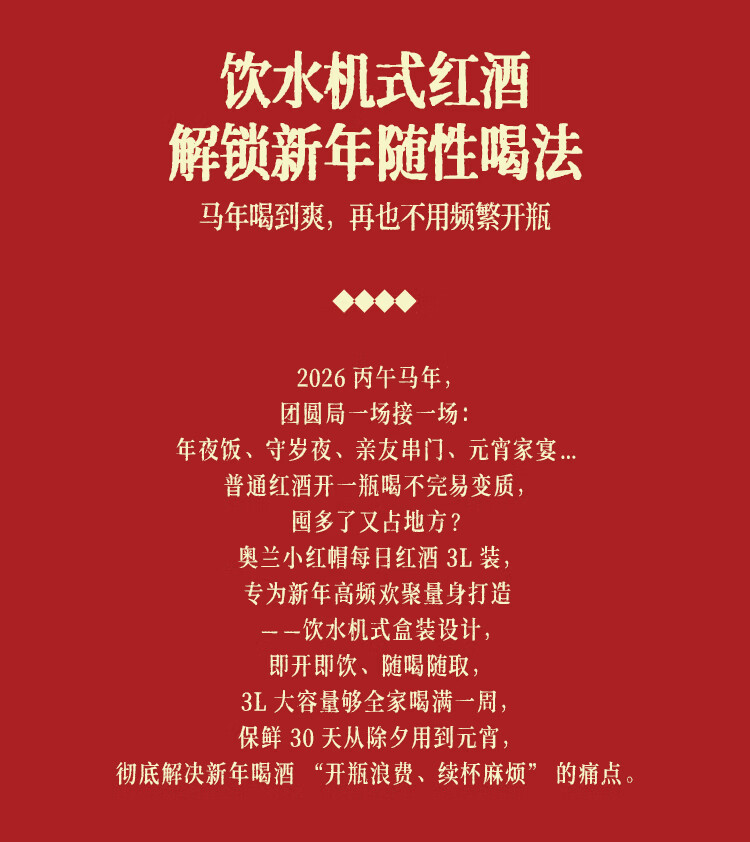 奥兰小红帽每日红酒干红葡萄酒 3L 装*1 饮水机式红酒 年货送礼