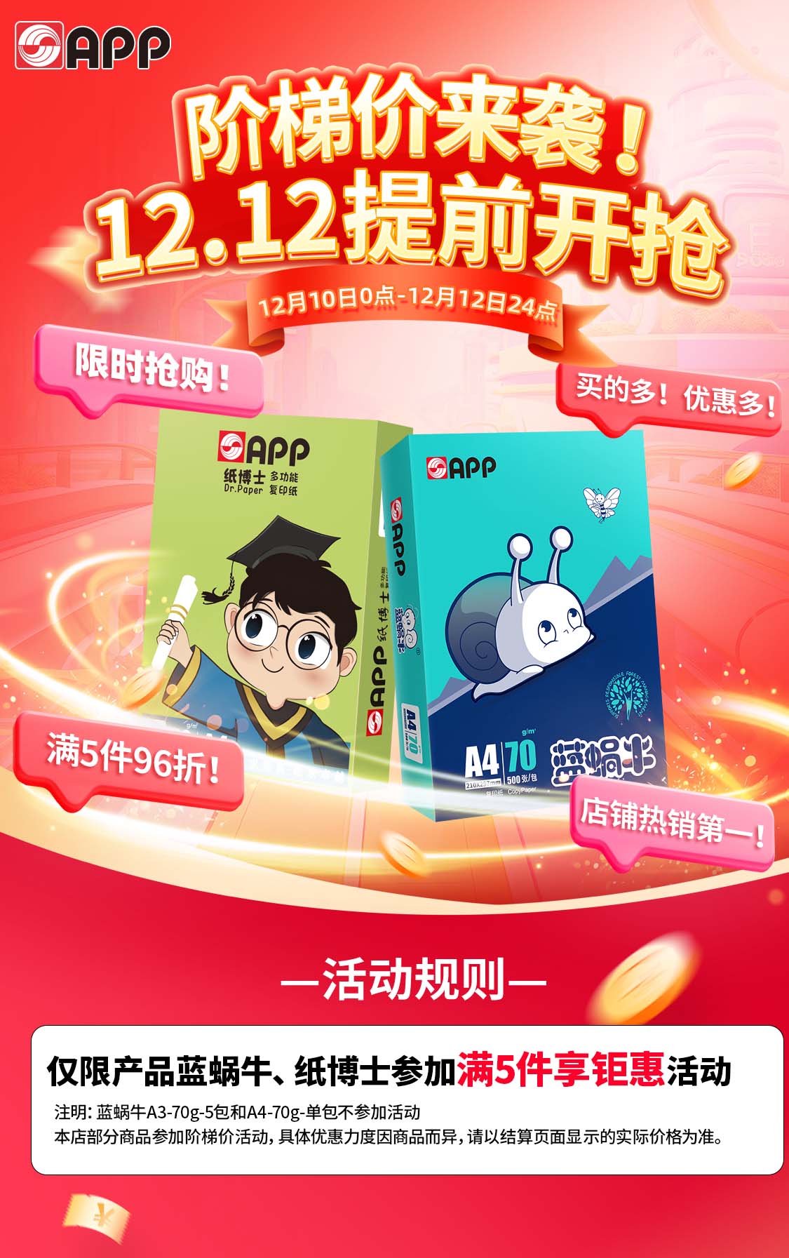 APP 金光APP (蓝蜗牛)A4/70g 复印纸 顺滑不易卡纸双面打印纸A4纸整箱 500张/包 5包/箱(2500张)
