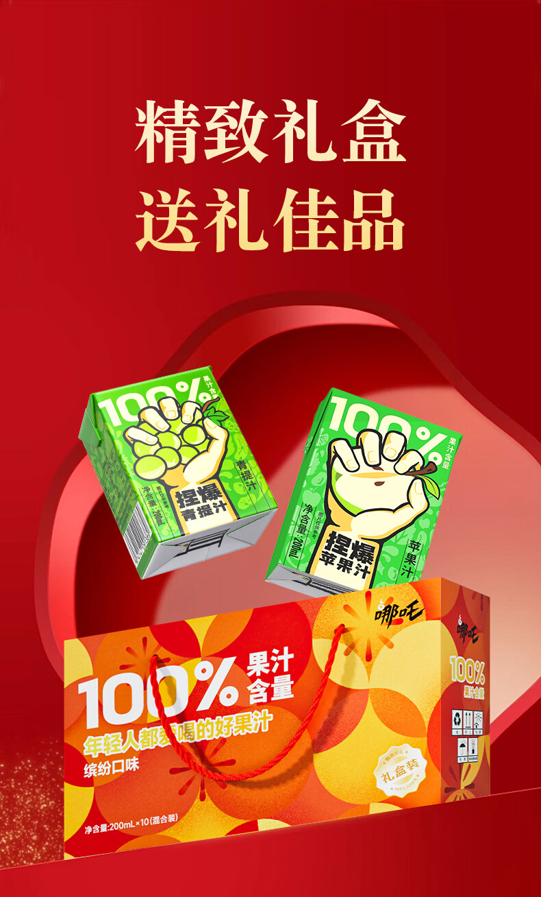 哪吒100%苹果青提蜜桃甜橙西梅汁益生菌椰子水年货节礼盒早餐饮料品 甜橙蜜桃苹果青提4口味各3盒共12盒 哪吒捏爆系列