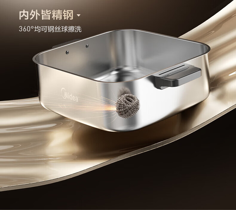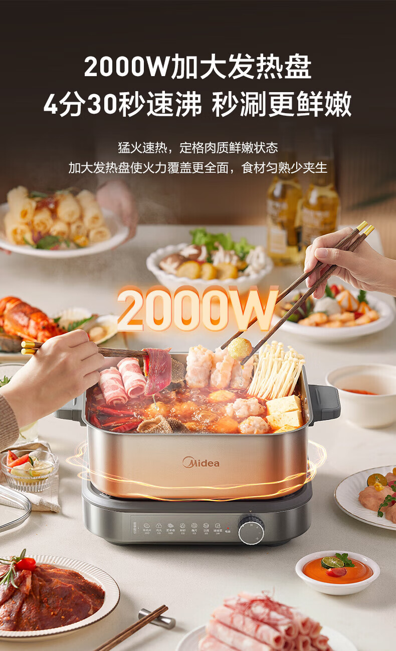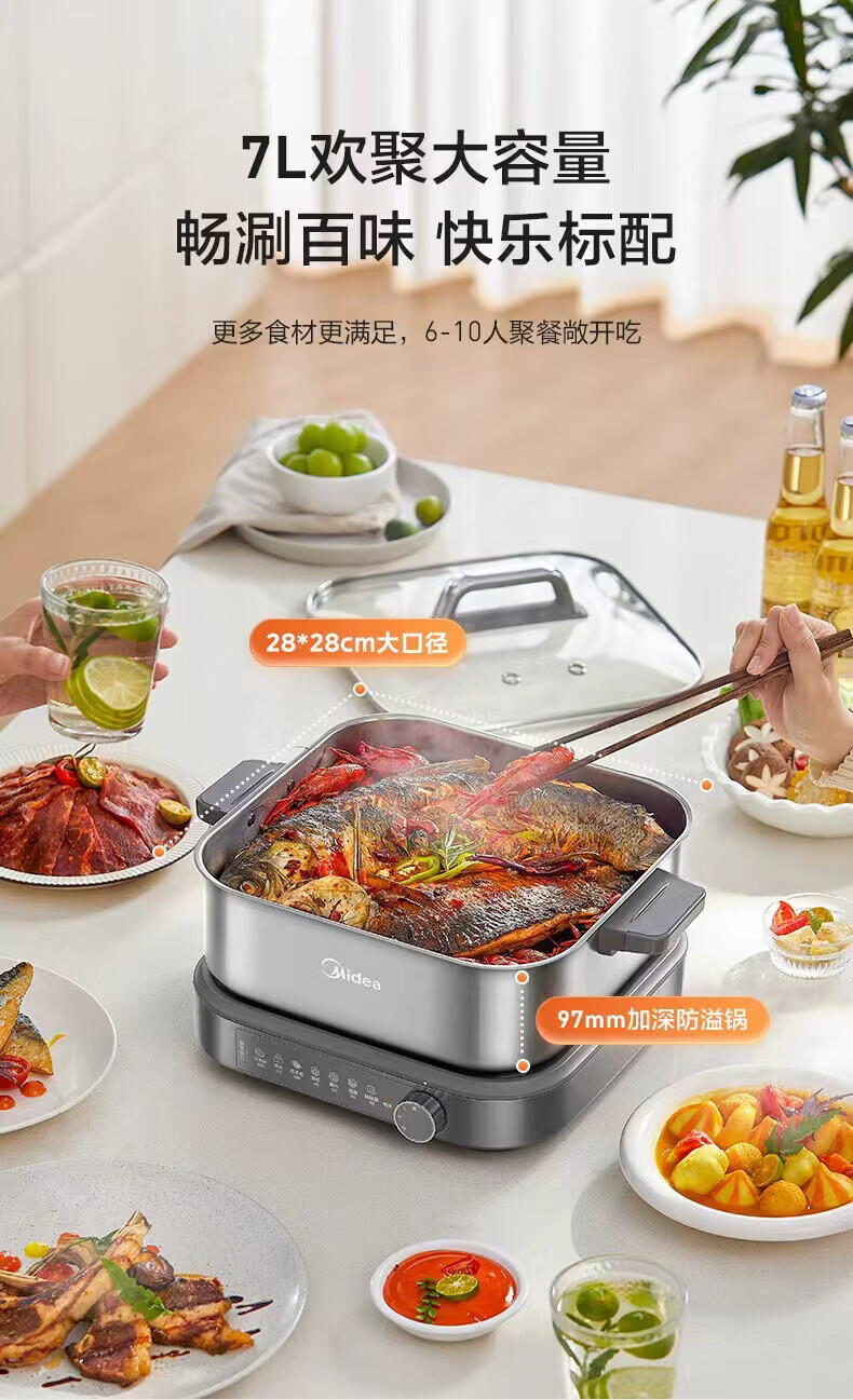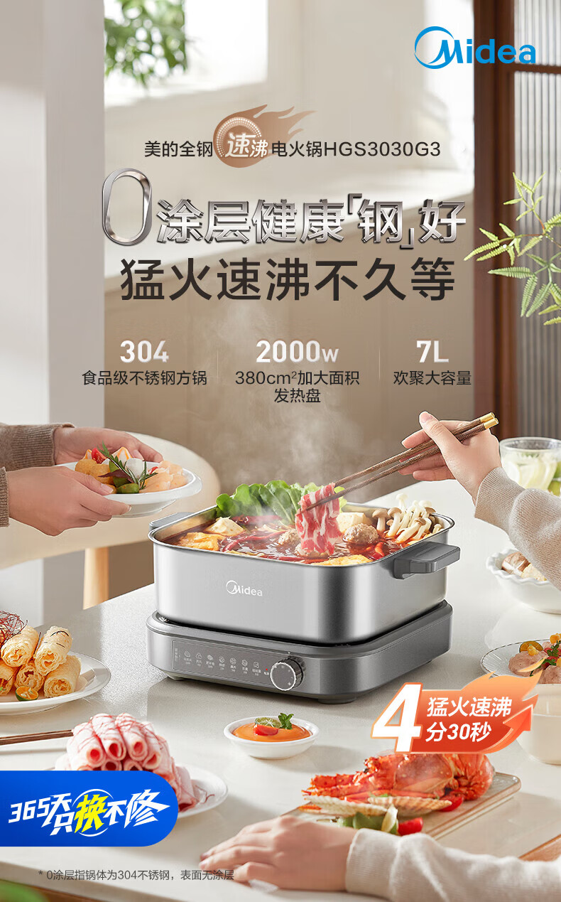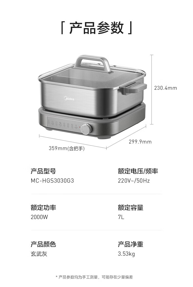 美的(Midea)0涂层电火锅电煮锅不锈钢速沸火锅专用锅分体可拆电热锅多功能锅7L多功能锅HGS3030G3