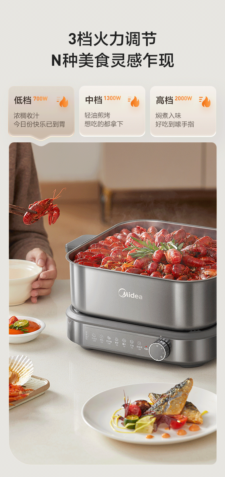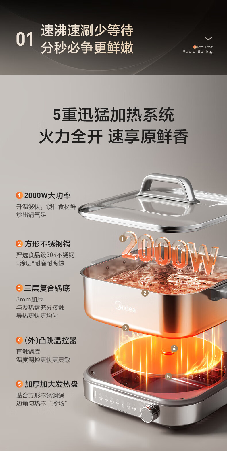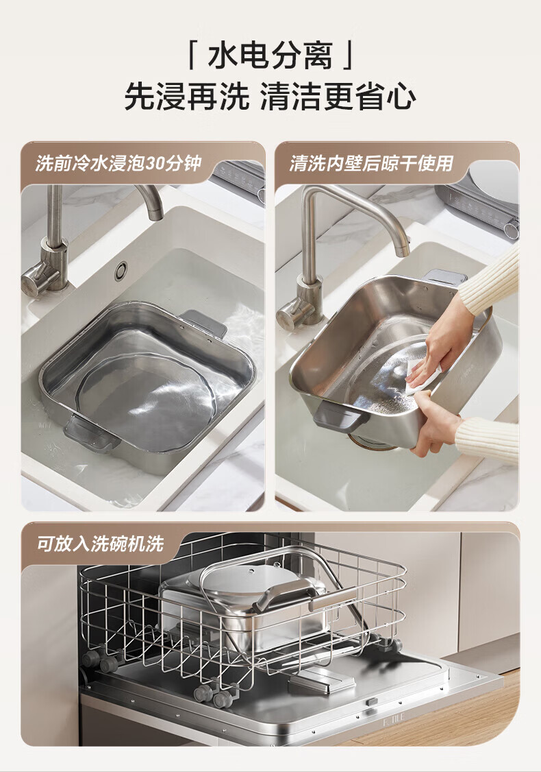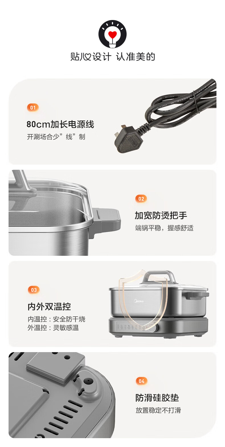 美的(Midea)0涂层电火锅电煮锅不锈钢速沸火锅专用锅分体可拆电热锅多功能锅7L多功能锅HGS3030G3