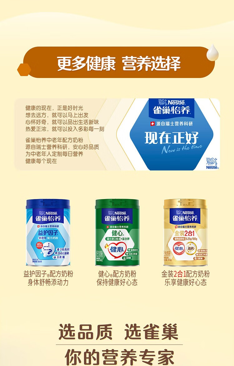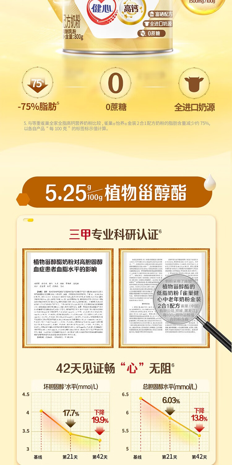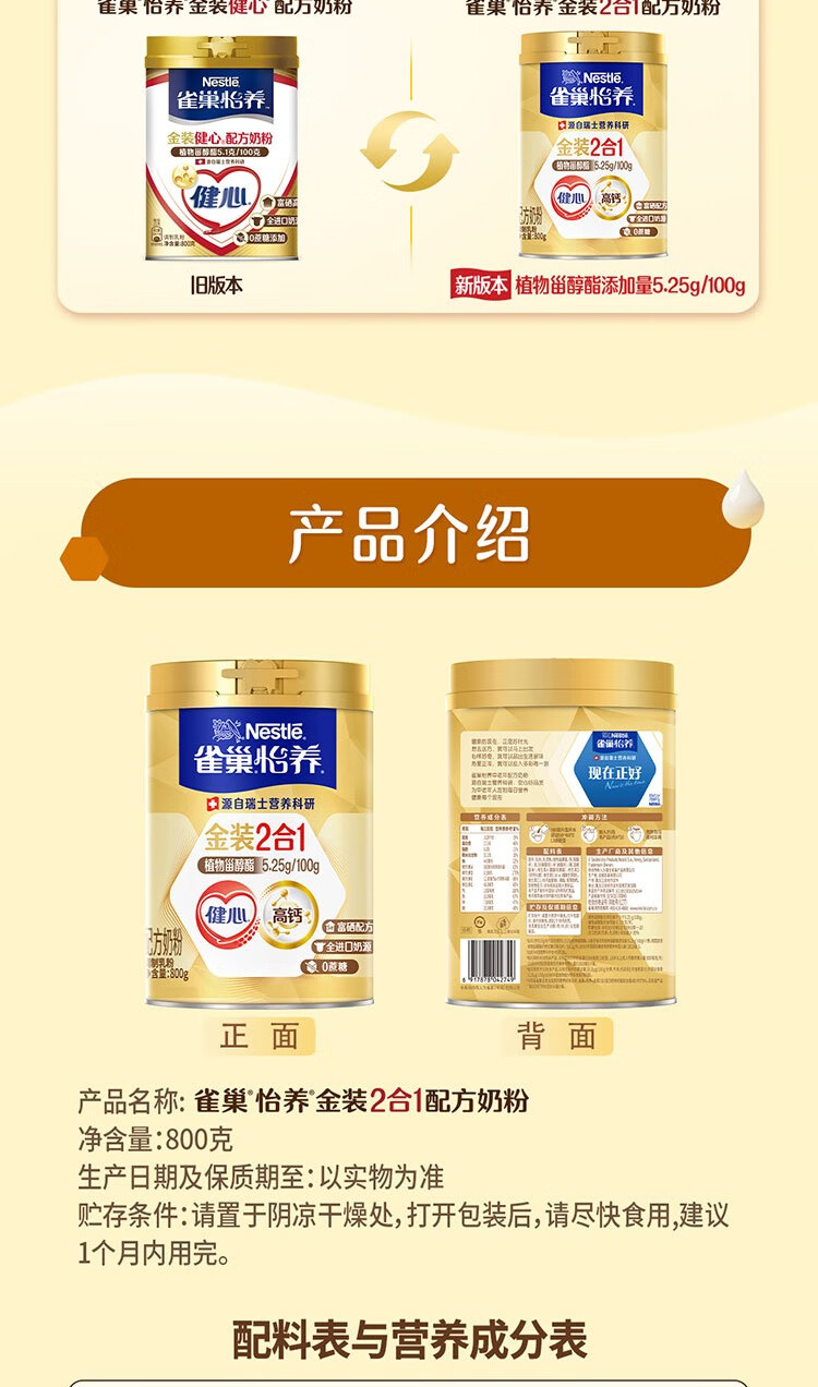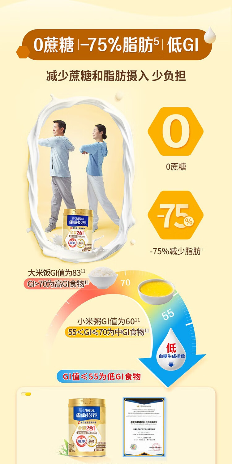雀巢(Nestle)【侯明昊推荐】怡养金装健心中老年低GI奶粉礼盒800g植物甾醇酯