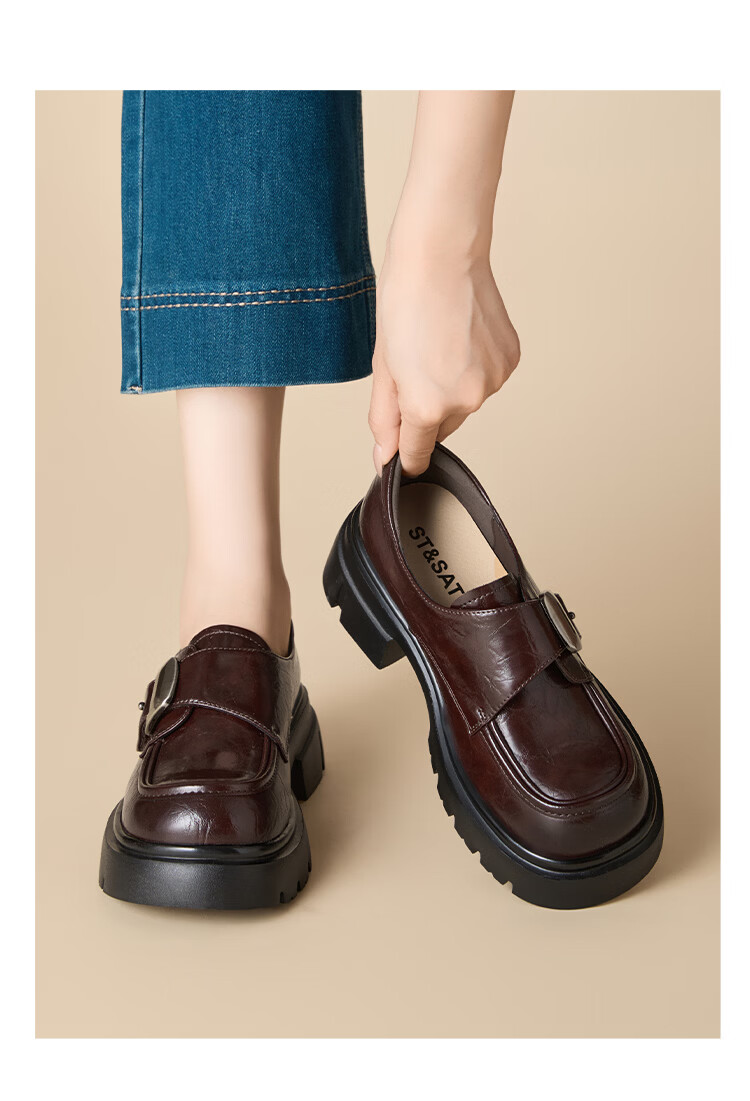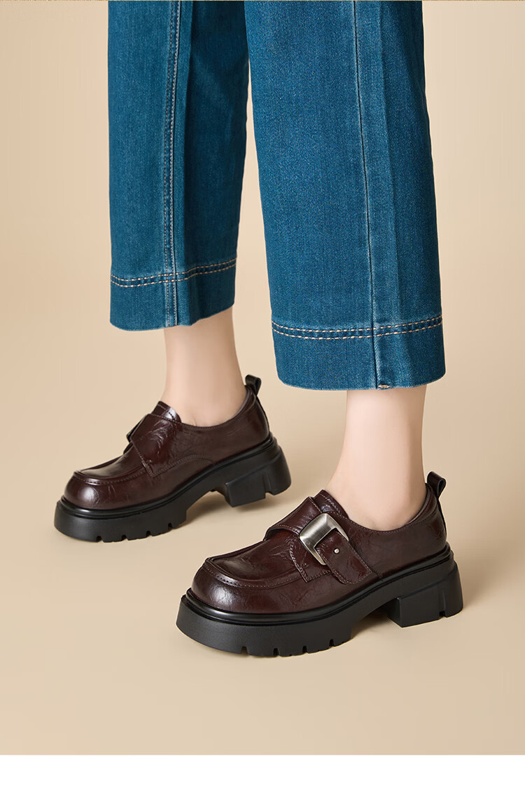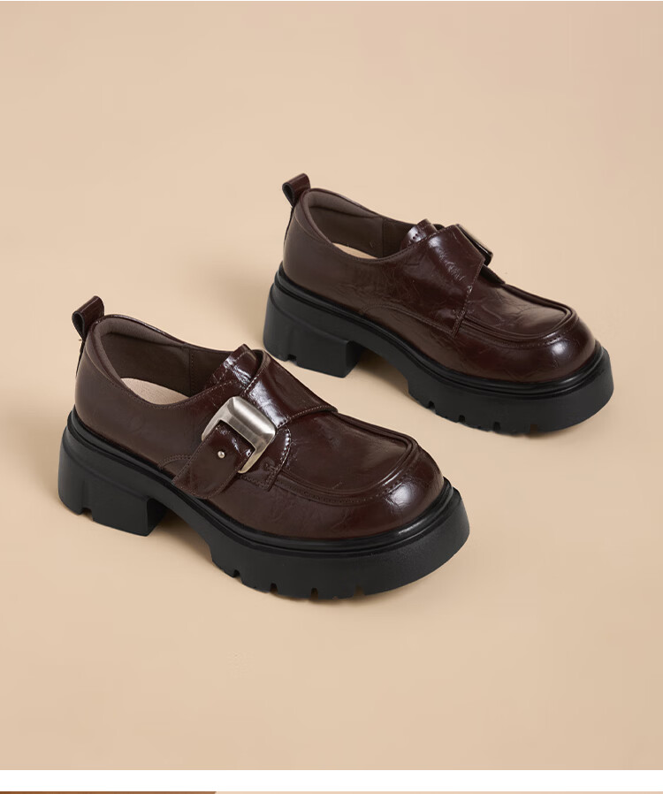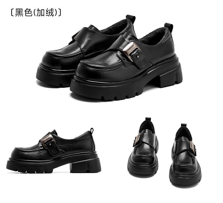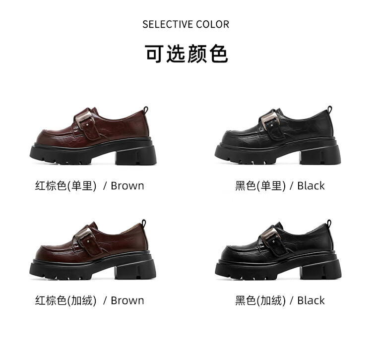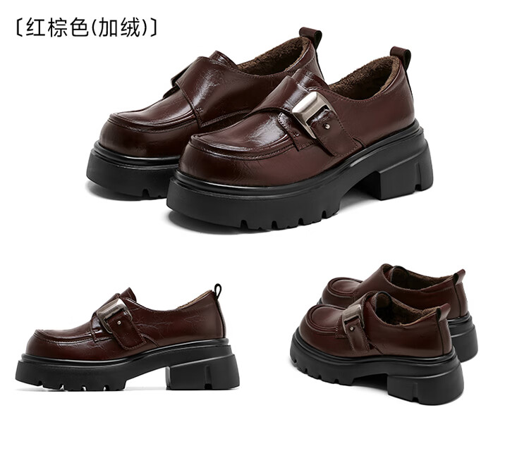星期六加绒乐福鞋女2025冬季新款黑色保暖英伦风小皮鞋毛毛棉鞋子 红棕色(加绒) 【冬季保暖】 35