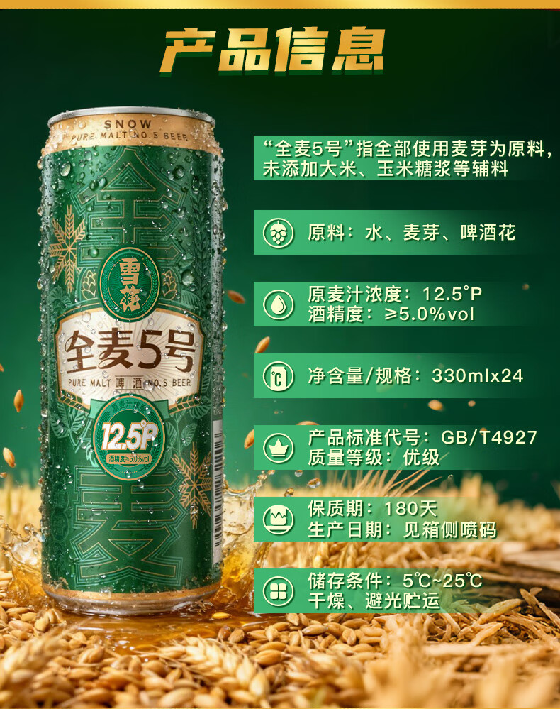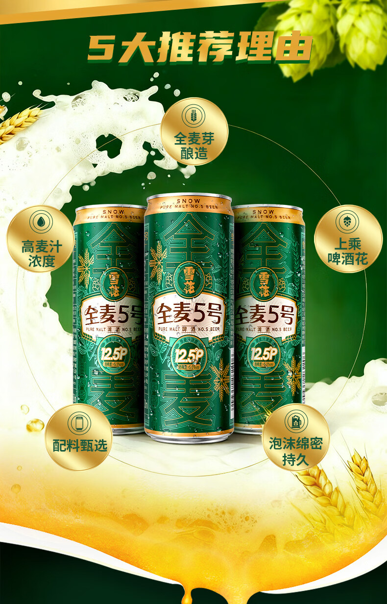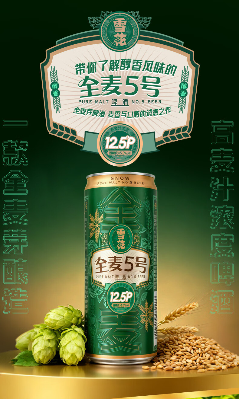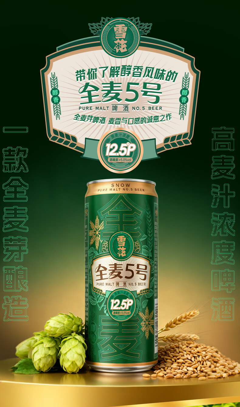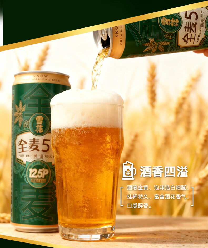 雪花啤酒 全麦5号 全麦芽高浓度醇香啤酒 全麦芽 500mL 21罐 整箱装 到期日2月