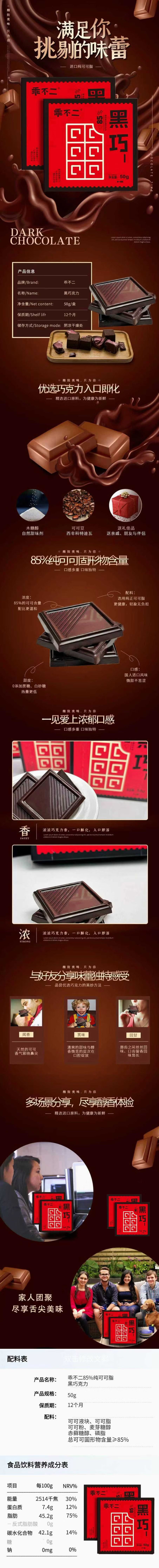 乖不二【黑巧爆款回归】纯可可脂0蔗糖85%纯黑巧克力休闲零食'圣诞礼物' 50g*五盒装黑巧