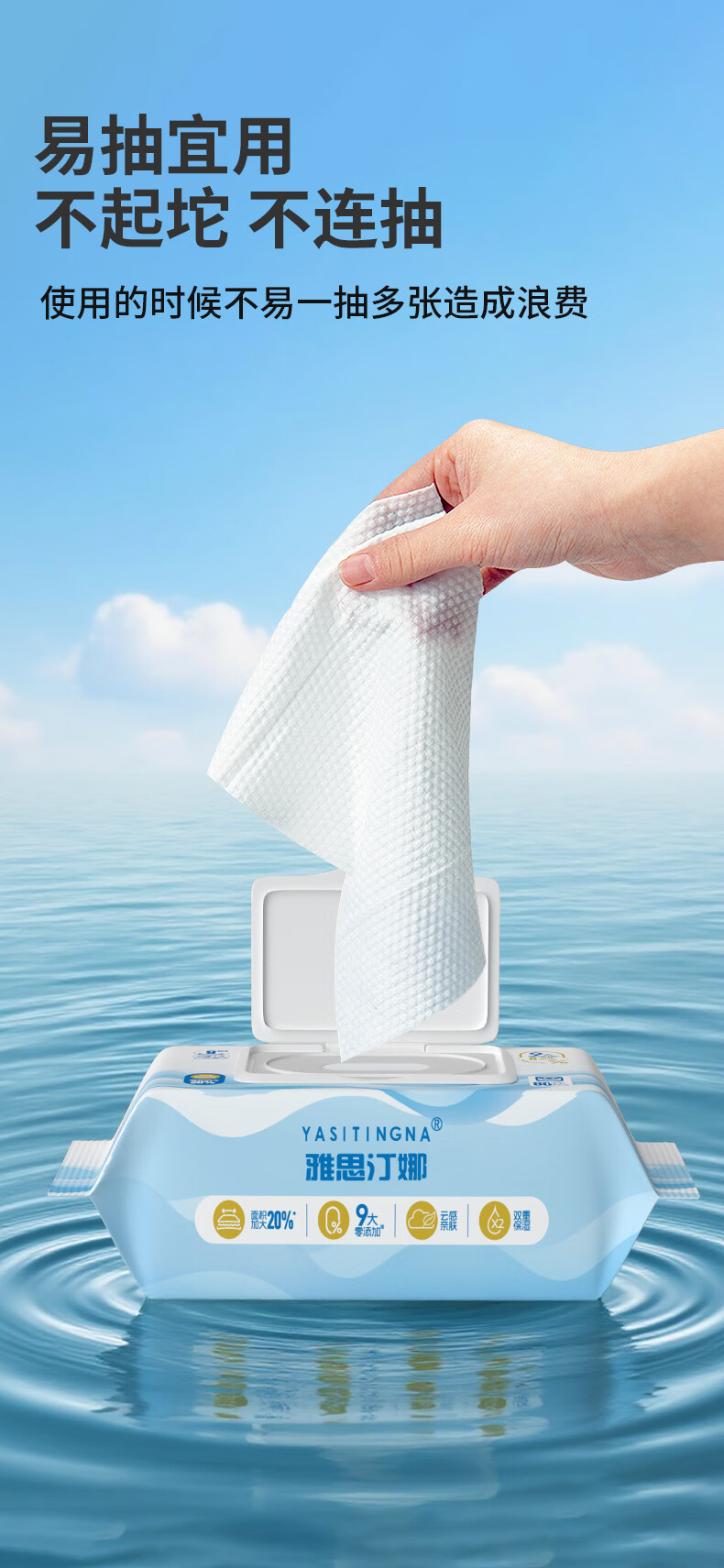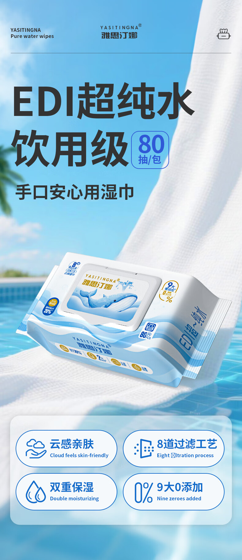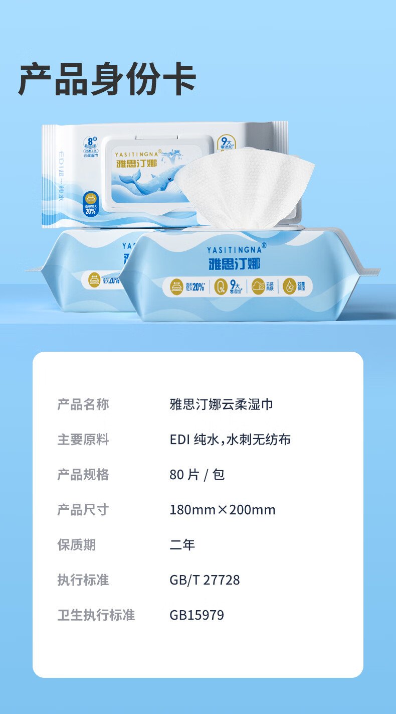 雅思汀娜湿巾EDI纯水湿纸巾80抽保湿亲肤不含酒精手口可用180*200mm 80抽*3包