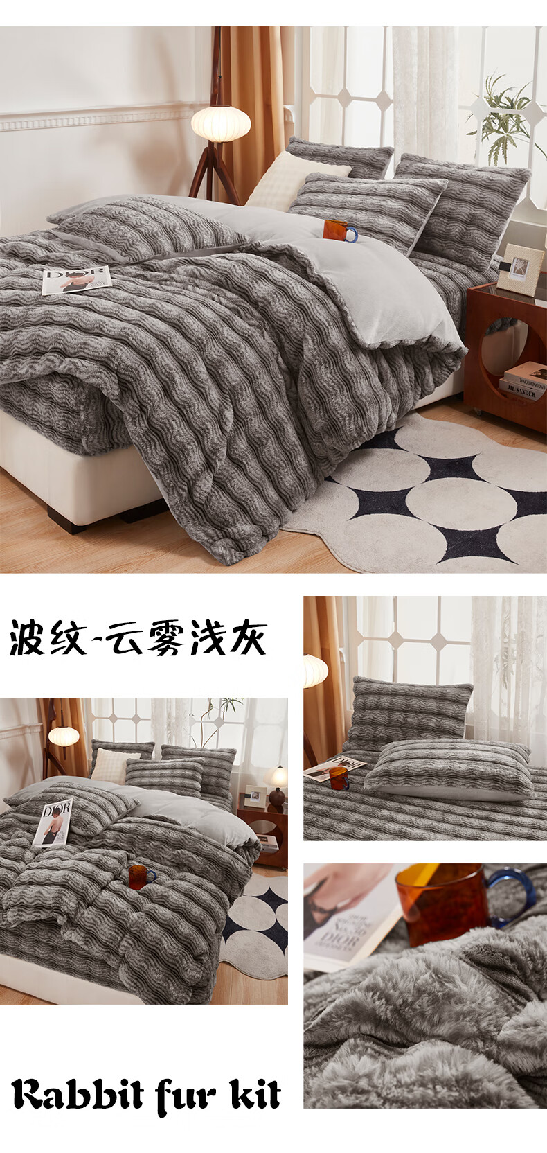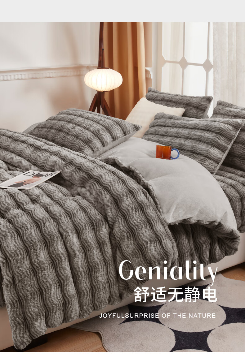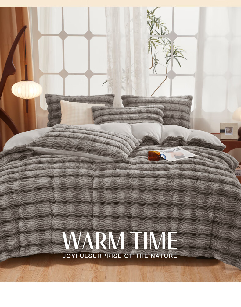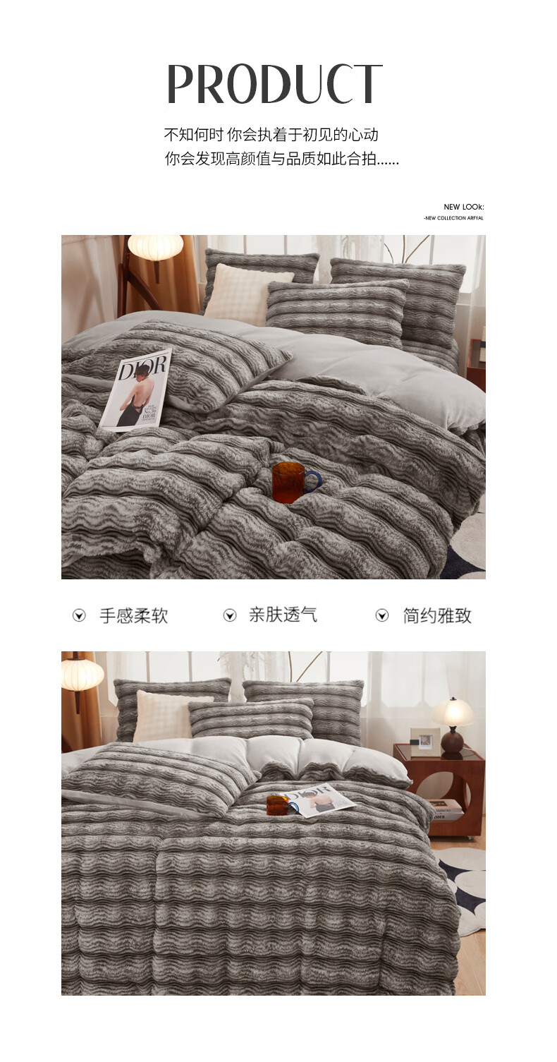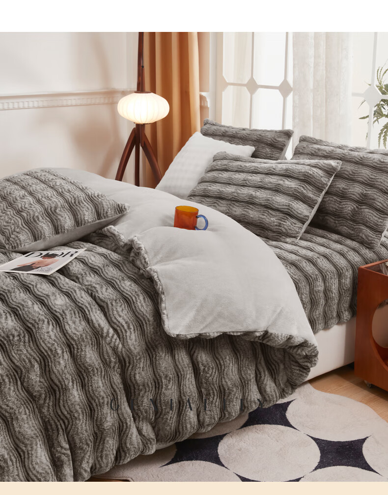 元族2025新款加厚兔毛绒纯色四件套套件系列 波纹-云雾浅灰 床单款 150*200cm单被套