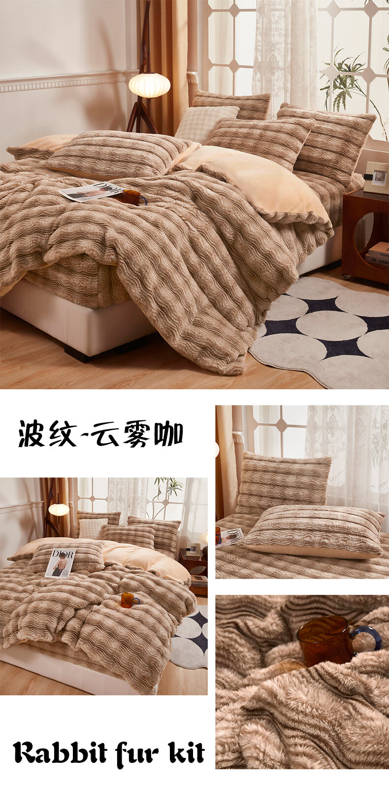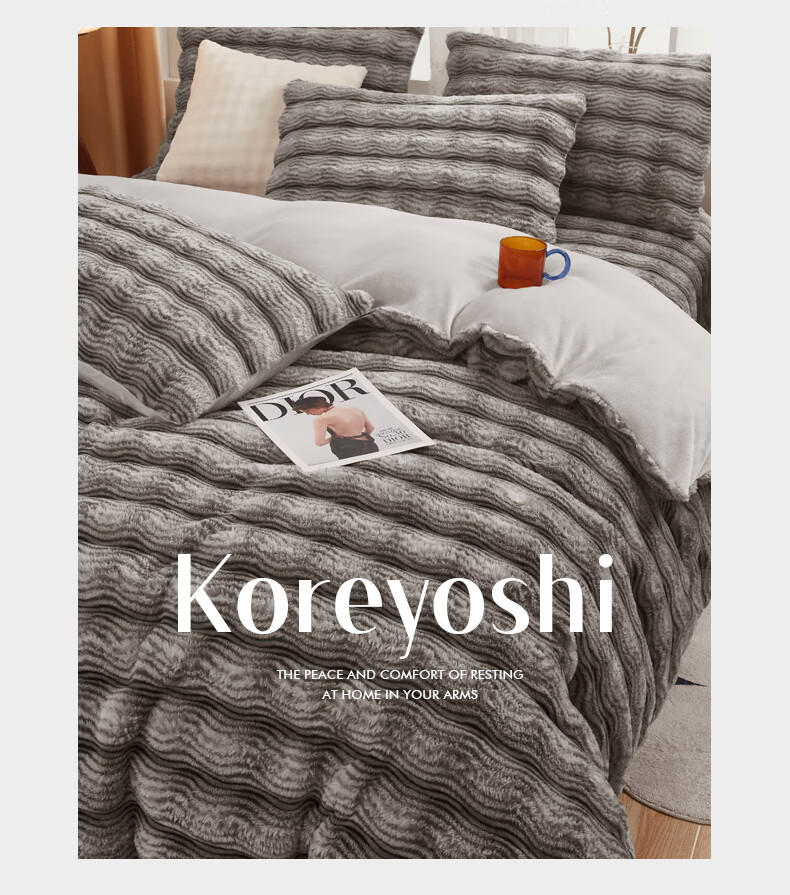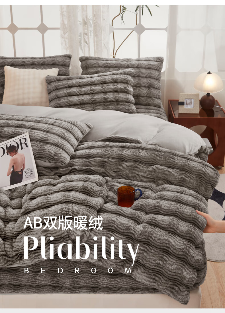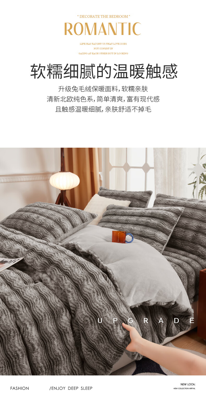 元族2025新款加厚兔毛绒纯色四件套套件系列 波纹-云雾浅灰 床单款 150*200cm单被套