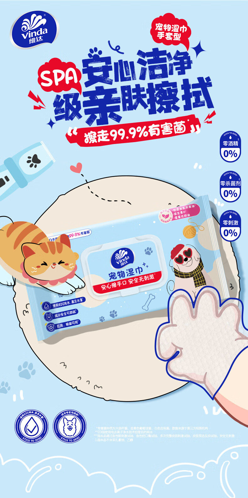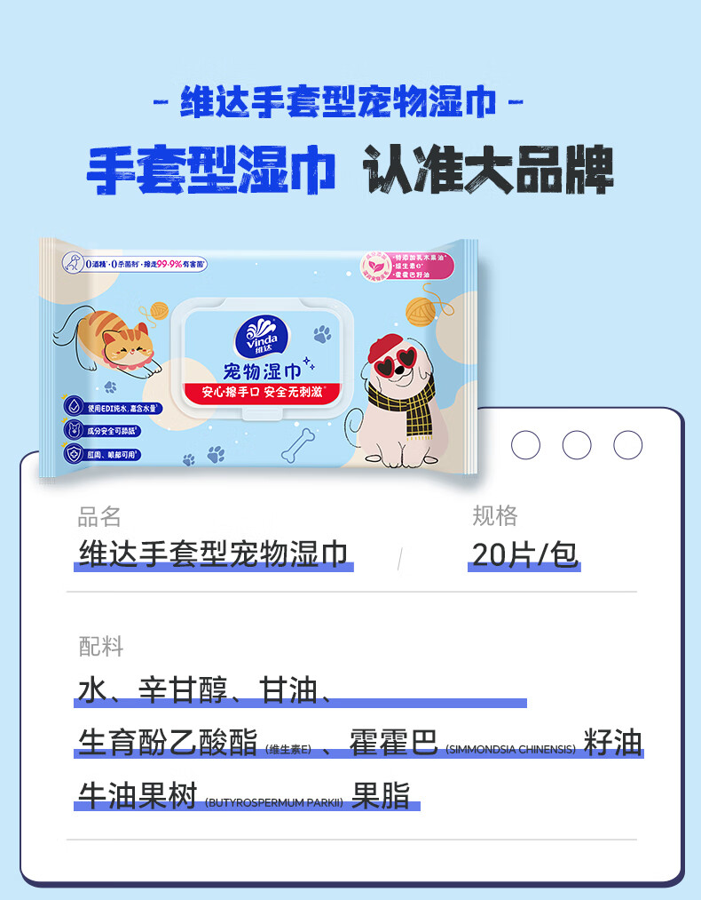 维达(Vinda)宠物湿巾免洗手套20片*16包 猫咪狗狗干洗澡湿巾神器全身清洁