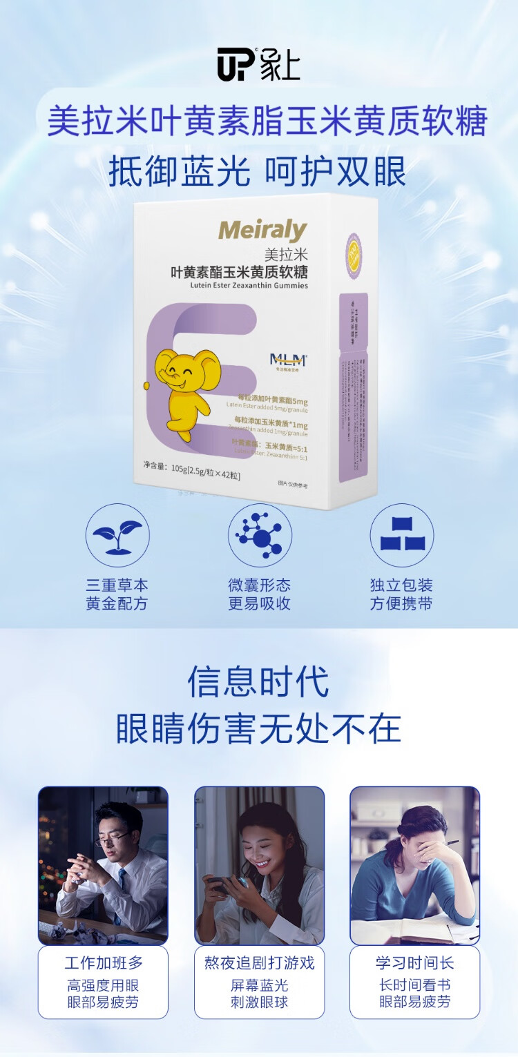美拉米叶黄素酯玉米黄质软糖升级新包装科学配比精准营养每盒105克42粒 6盒(买6盒送4盒)