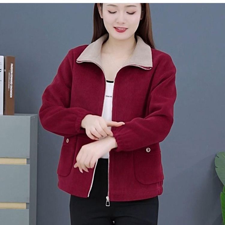 灯芯绒加绒加厚外套妈妈洋气上衣中年时尚翻领短款小个子新款休闲