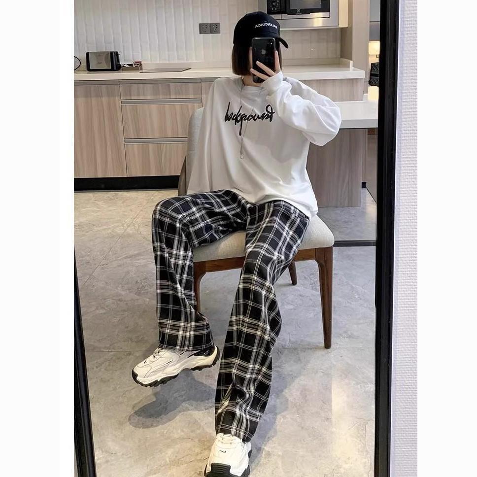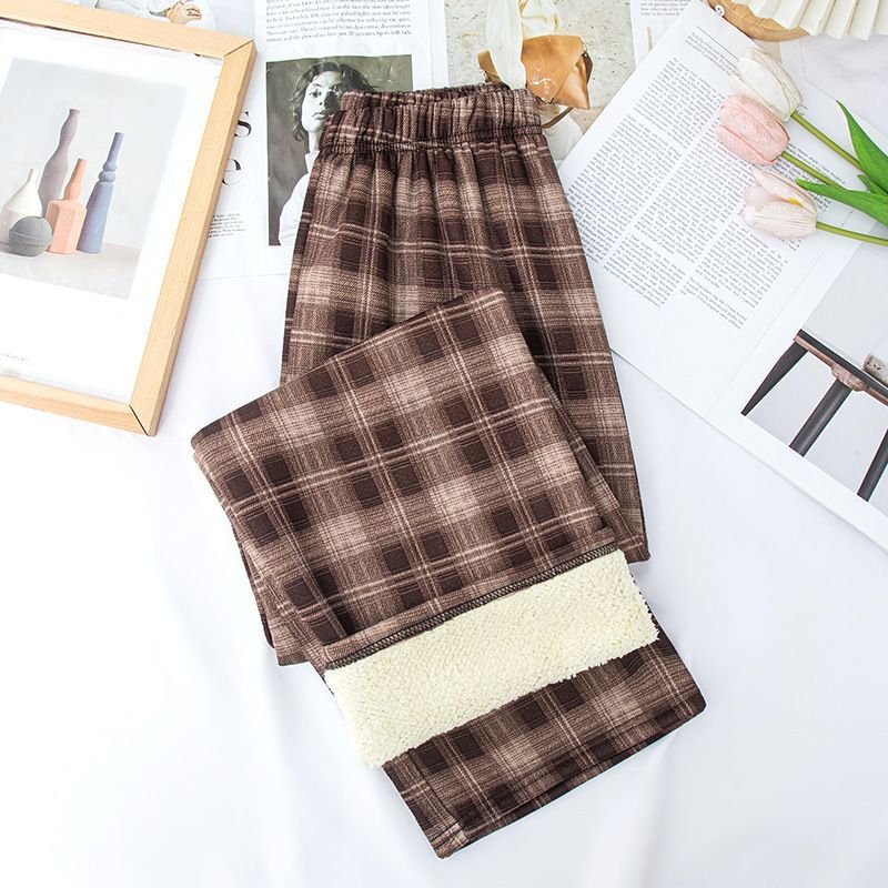 裤子阔腿加绒加厚羊羔绒休闲裤格子裤女新款高腰宽松保暖休闲长裤