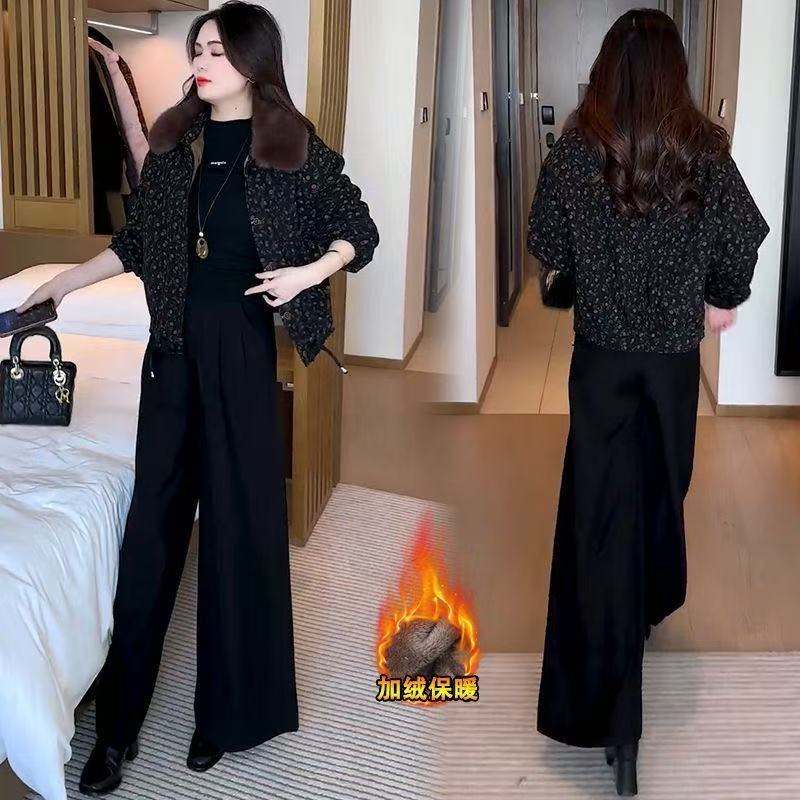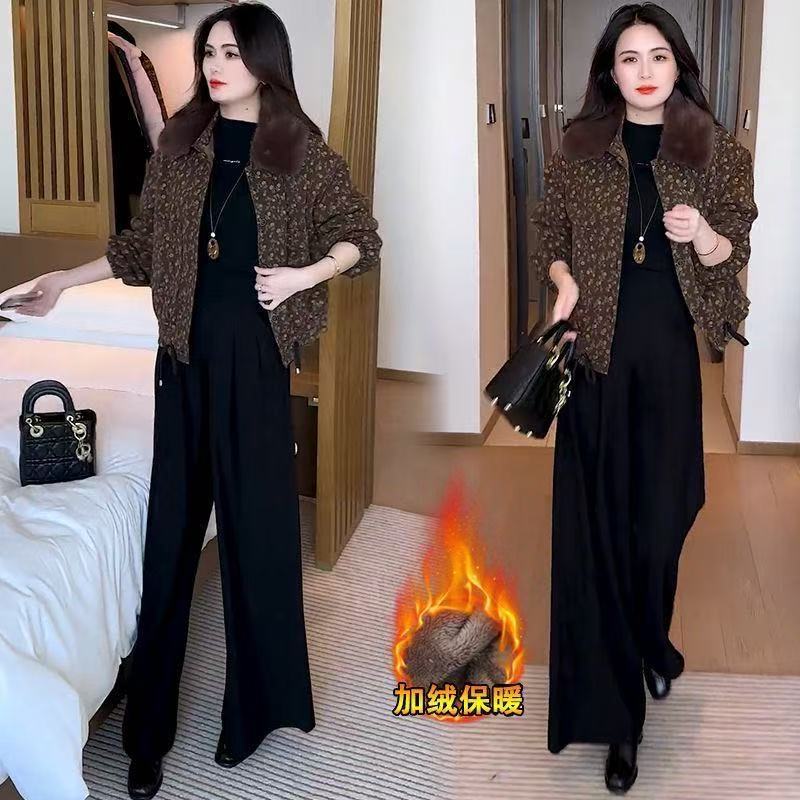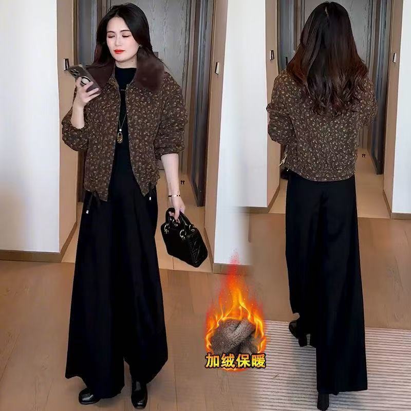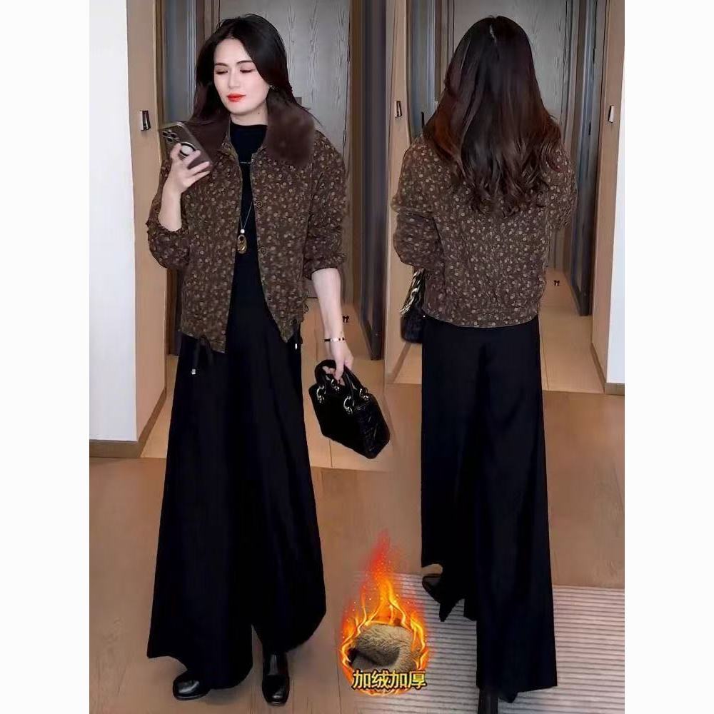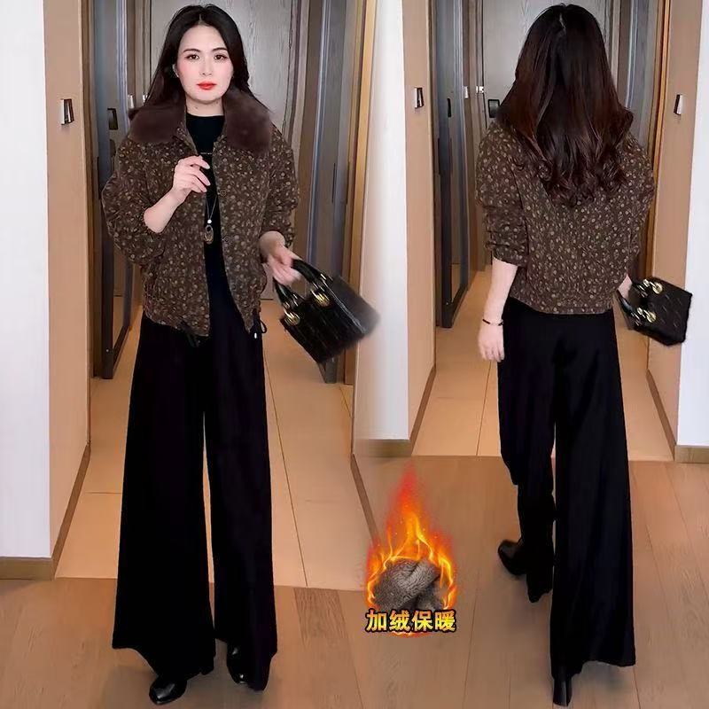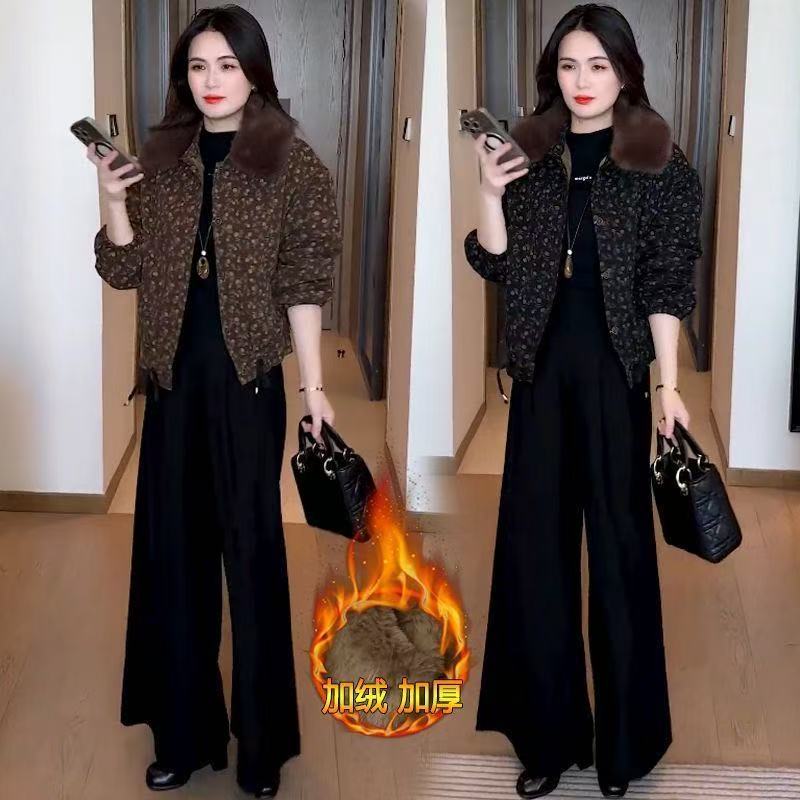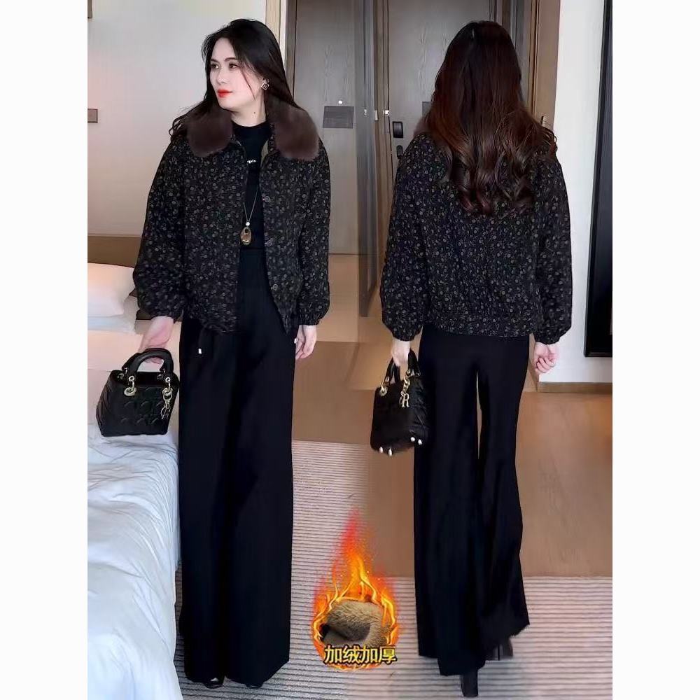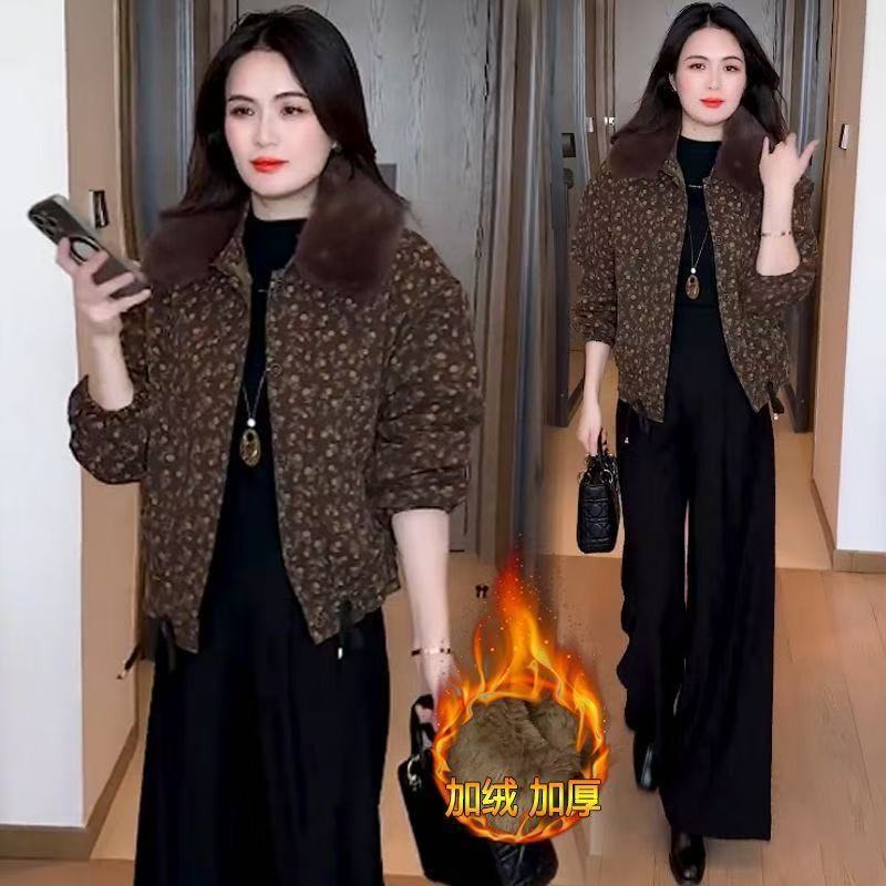 2025冬季妈妈新款印花短款外套女加绒加厚洋气显瘦保暖大毛领上衣