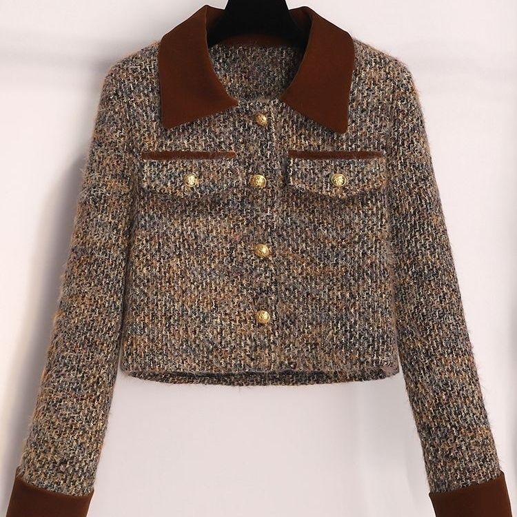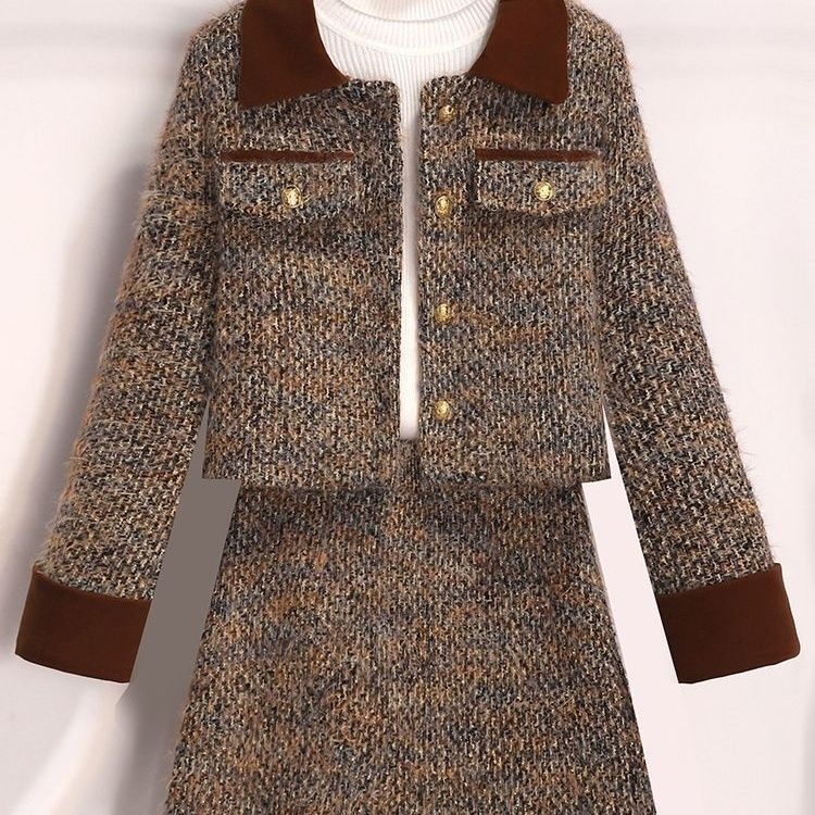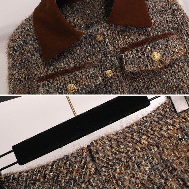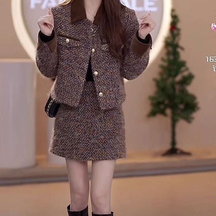2025时尚甜美香风秋冬新款外套两件套加厚减龄气质半身裙咖色套装