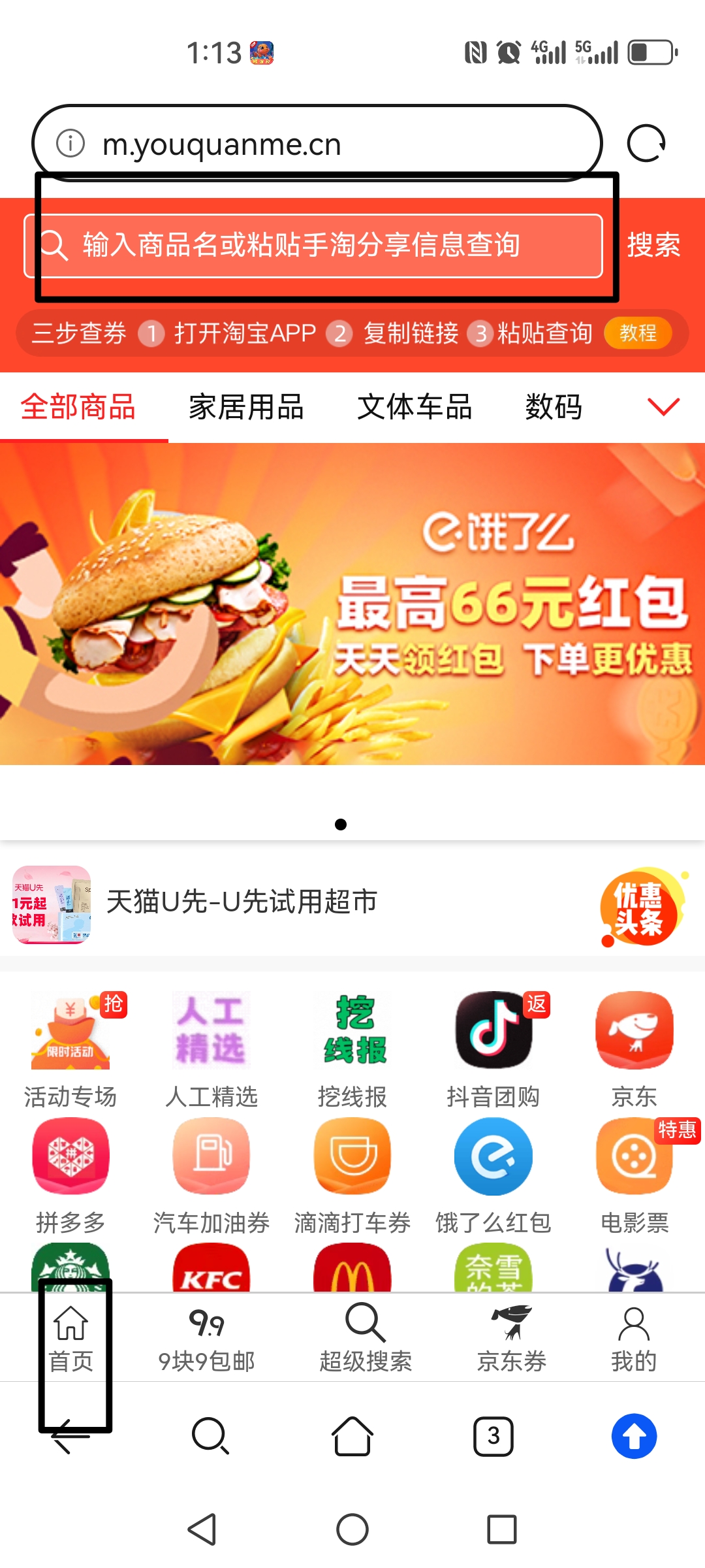 1、进入深饷优惠券网(m.youquanme.cn)首页,在上面输入需要搜索的商品名称或你在淘宝看到的商品标题,然后点“搜索”。