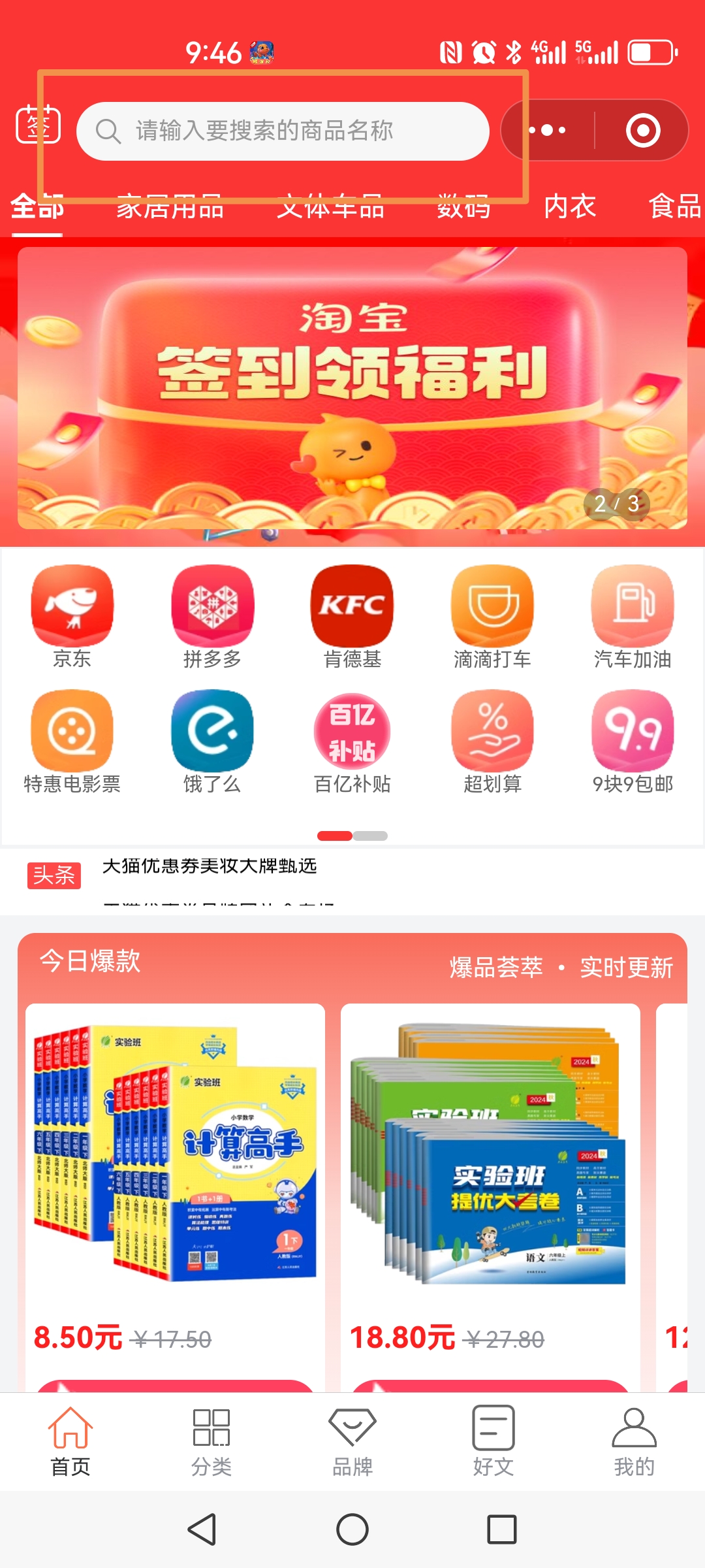 1、进入”券悦购“微信小程序首页,点击”请输入要搜索的商品名称“处