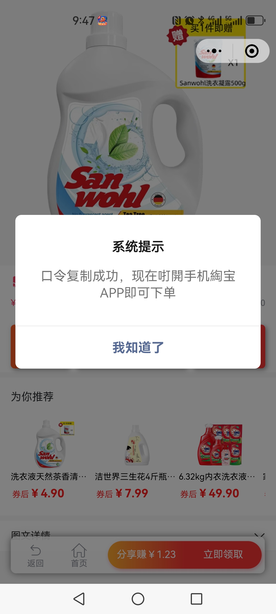 5、然后点“我知道了”复制淘口令再登录手机淘宝APP领券购买