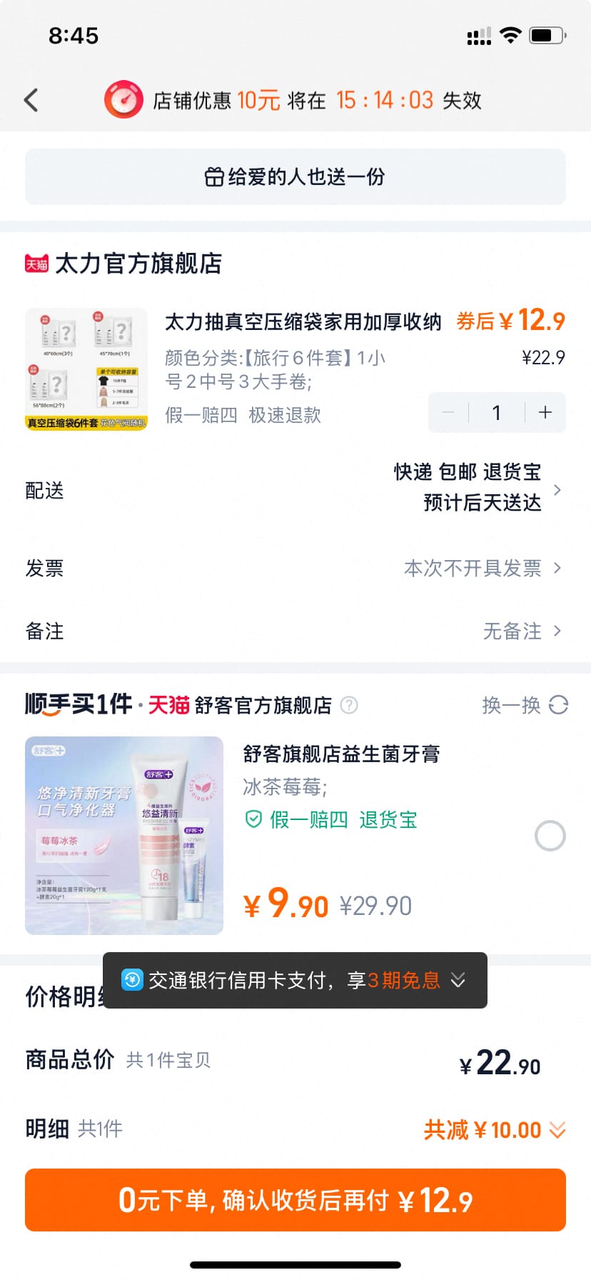 太力真空压缩袋 旅行出差收纳必备,6件套到手12.9元